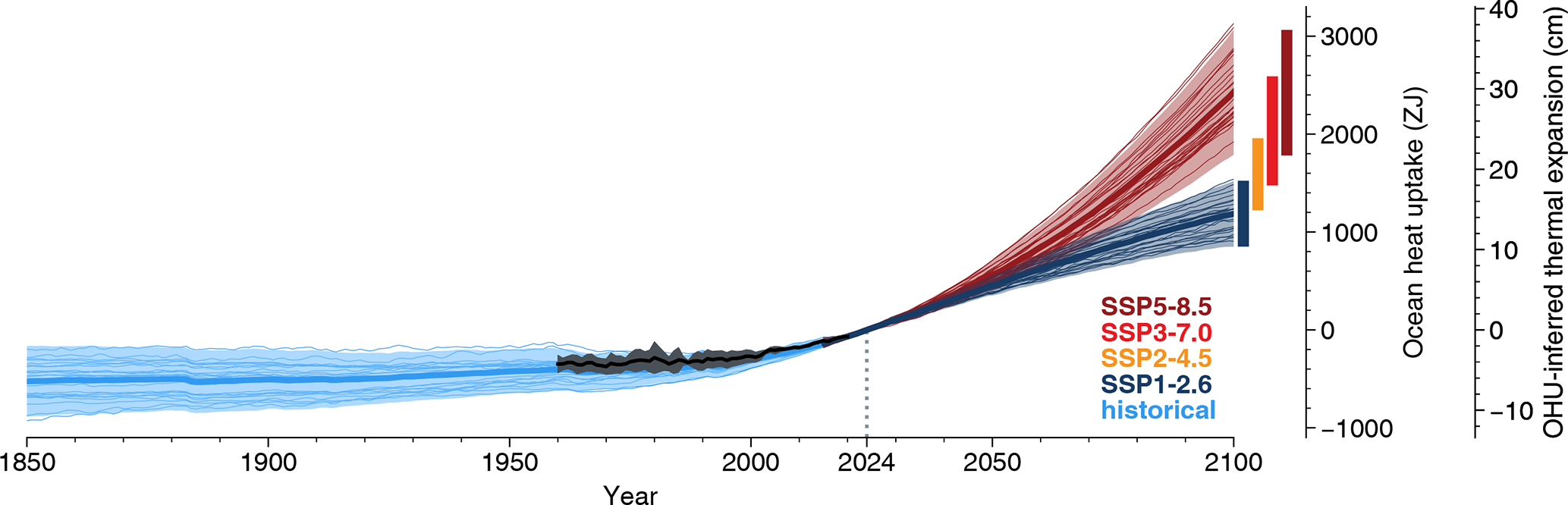 Since the beginning of the industrial period, the ocean has taken up over 90 % of the excess heat generated by human-caused climate change (Forster et al., 2021). This ocean heat uptake (OHU) has limited the rate of atmospheric temperature increase (Liu et al., 2016), but the widespread warming of the ocean (Johnson and Lyman, 2020) has had cascading negative consequences for humans and marine ecosystems. Ocean warming contributes to sea level rise through thermal expansion and the melting of marine-terminating glaciers (Cazenave and Llovel, 2010). Sea level rise and ocean warming create risks for coastal communities due to increased flooding and more destructive tropical cyclones (Sun et al., 2017; Pörtner et al., 2022). Higher upper-ocean temperatures also lead to changes in stratification and the supply of nutrients and oxygen to marine ecosystems (Sallée et al., 2021; Bopp et al., 2013; Morée et al., 2023), impacting fish stocks (Cheung et al., 2016) and perturbing the global carbon cycle (Joos et al., 1999; McNeil and Matear, 2013; Terhaar, 2024). Furthermore, ocean warming drives more frequent and intense marine heatwaves, potentially causing widespread collapses of foundation species, including corals, kelps, and seagrasses (Frölicher et al., 2018; Smith et al., 2023).