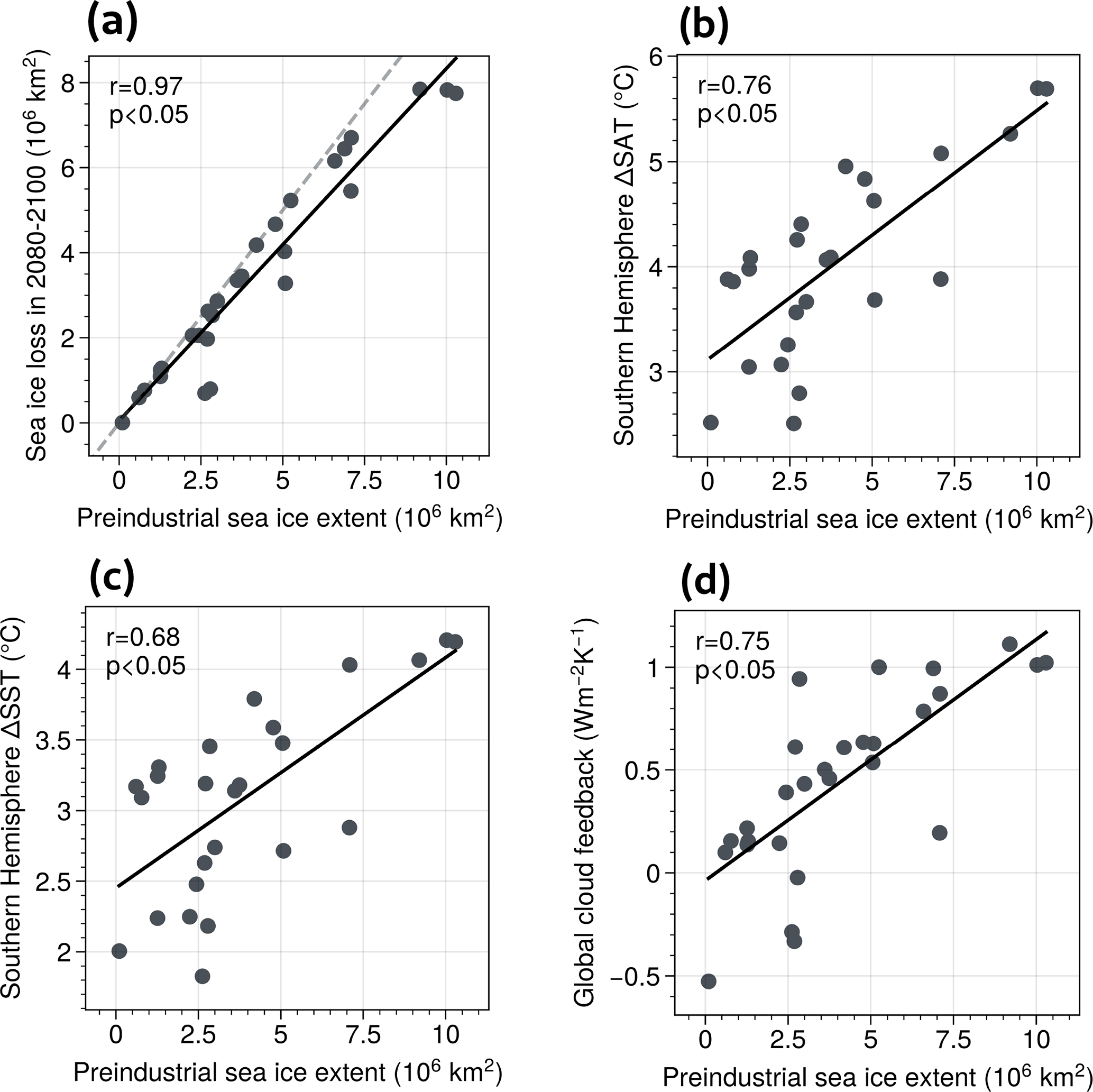 Figure 3Links between preindustrial Antarctic sea ice and Southern Hemisphere climate change. CMIP6 inter-model relationship between preindustrial Antarctic summer (January–February) sea ice extent and future sea ice extent loss (a), Southern Hemisphere surface air temperature increase (b), Southern Hemisphere sea surface temperature increase (c), and global mean cloud feedback parameter (d). In each panel, the black line shows the least-squares linear regression fit, and the Pearson correlation coefficient r and the two-sided p value are given in the upper-left corner. The y axis of all panels represents anomalies between years 2080–2100 of the high-emission SSP5-8.5 scenario and the preindustrial state.