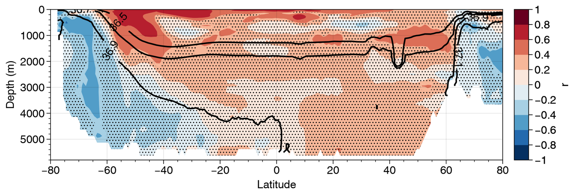 Figure 4Zonal mean ocean warming related to preindustrial sea ice extent. Correlation coefficient across the ensemble of CMIP6 models between preindustrial annual mean Antarctic sea ice extent and zonal mean ocean warming in 2080–2100 under SSP5-8.5 relative to preindustrial. Red shading indicates regions where models with more preindustrial sea ice tend to have more ocean warming in the future scenario. Stippling indicates regions where the correlation is not significant (p≥0.05, two-sided). Black contours show zonal mean potential density referenced to 2000 dbar from observations (Garcia et al., 2019).