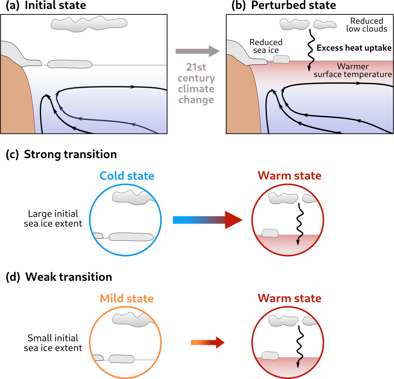 Figure 6Schematic representation of the link between historical Antarctic sea ice extent and future ocean heat uptake. Under 21st-century climate change, the Southern Hemisphere climate system transitions from an initial state (a) to a perturbed state (b) characterized by reduced sea ice, surface ocean and atmospheric warming, and reduced lower cloud cover. Crucially, the amplitude of this transition in each climate model, and therefore the magnitude of future ocean heat uptake, depends on the model's initial climate state: a cold initial state characterized by large sea ice extent leads to a strong transition with high heat uptake (c), while a mild initial state characterized by small sea ice extent leads to a weaker transition with less heat uptake (d).