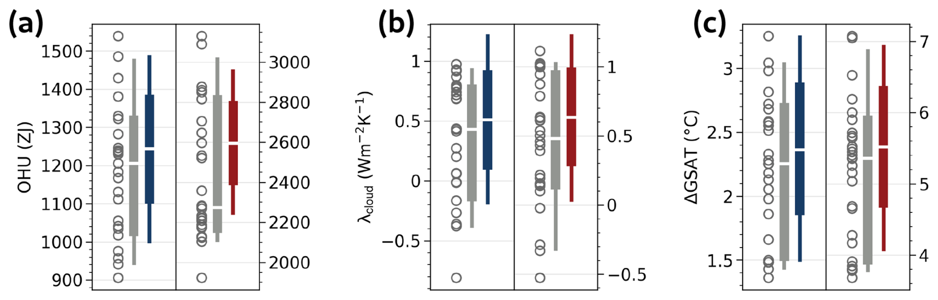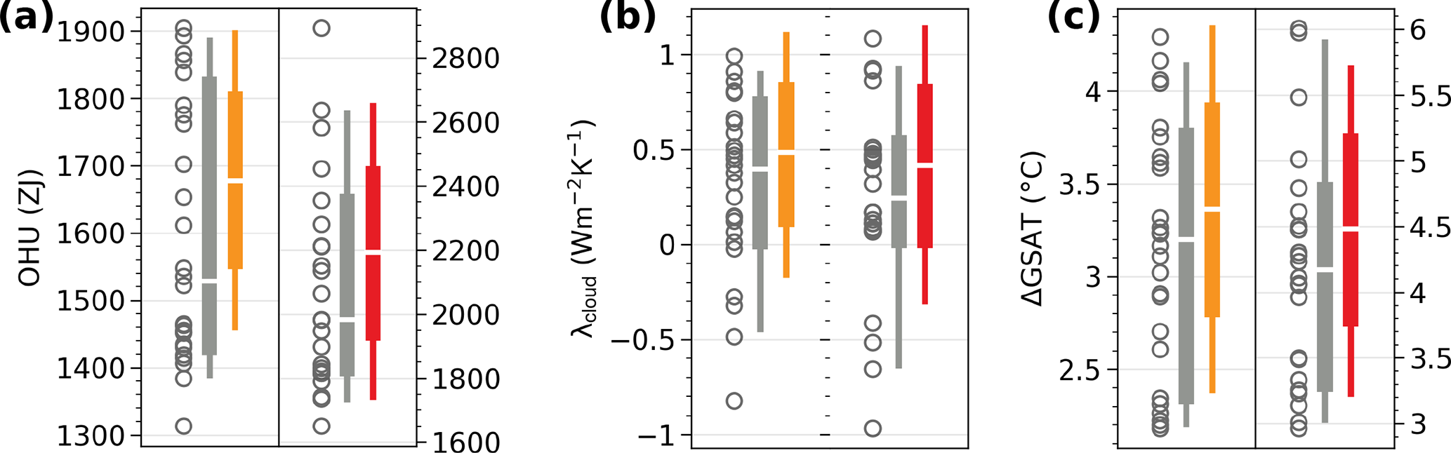 Figure 8Constrained distributions of global OHU, cloud feedback, and warming. Prior and constrained distributions of (a) cumulative global OHU from 2024 to 2100, (b) global mean cloud feedback parameter in 2080–2100, and (c) global mean surface air temperature (GSAT) anomaly in 2080–2100 relative to the preindustrial. In each panel, distributions are shown for SSP1-2.6 (left) and SSP5-8.5 (right). The gray circles and gray boxplots show the prior distribution of model values, and the blue and red boxplots show the constrained distributions for SSP1-2.6 and SSP5-8.5, respectively. In each boxplot, the white line shows the median, the central box spans the likely range (66 %), and the whiskers extend to a 95 % confidence interval. The constrained values are normally distributed by construction (Methods).