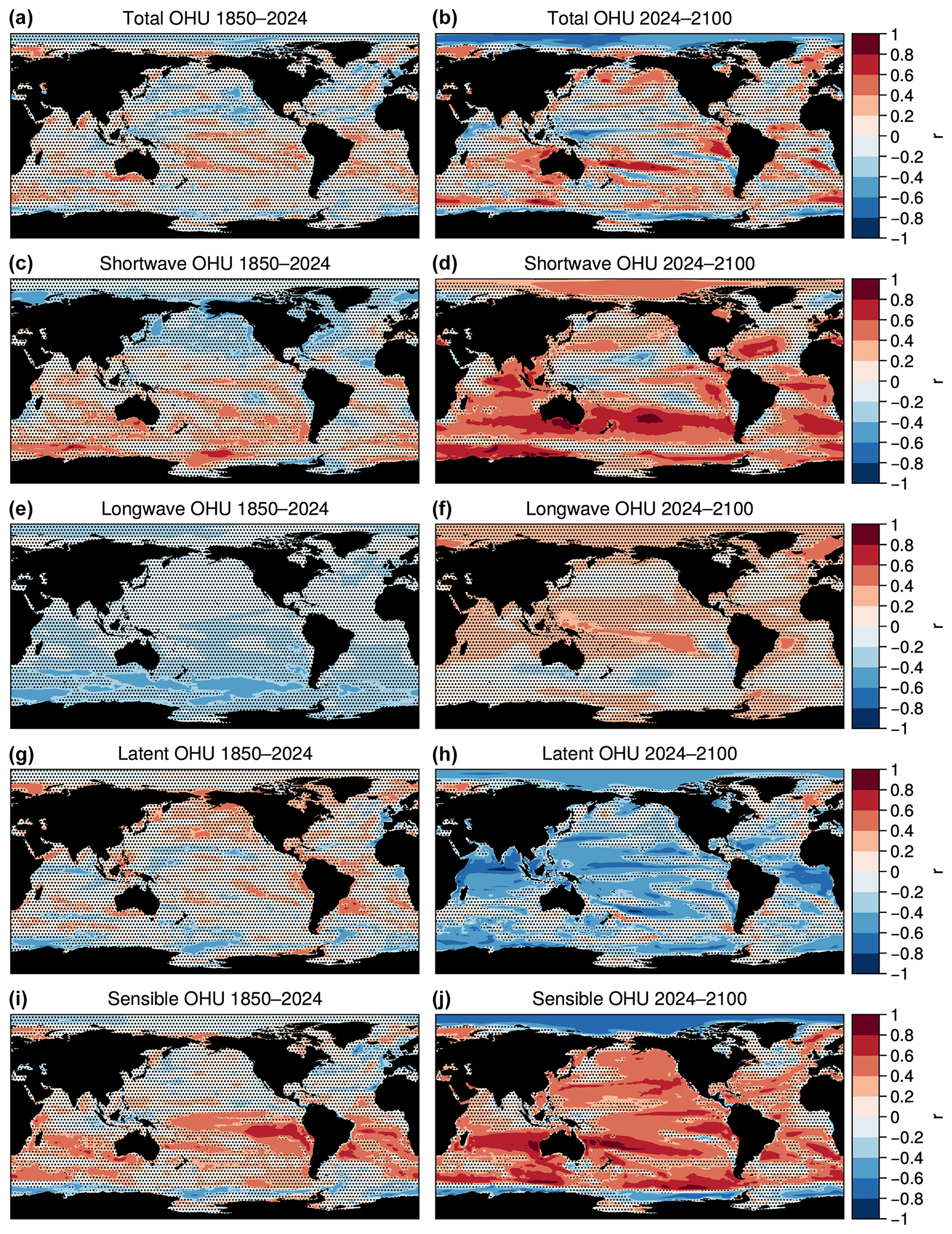 Decomposing cloud feedback into its shortwave and longwave radiative components reveals that the global relationship between sea ice loss and cloud feedback is mostly mediated by the shortwave component (Fig. A3c–d), whereas the longwave component remains restricted to the Southern Ocean by the end of the 21st century. Furthermore, partitioning the excess OHU into its individual air–sea heat flux components demonstrates that the higher OHU in models with greater Antarctic sea ice loss is mainly due to increased shortwave-driven OHU in the Southern Hemisphere and globally increased sensible OHU (Fig. A5). The increased sensible OHU is a direct consequence of the stronger atmospheric warming in models with more Antarctic sea ice loss. The increased shortwave-induced and sensible OHU associated with larger Antarctic sea ice loss is slightly counteracted by a reduced latent air–sea heat flux at low latitudes (Fig. A5h). As sea ice loss strongly accelerates after 2024, these relationships emerge only for future (2024–2100) OHU and are not apparent for OHU over the historical (1850–2024) period.