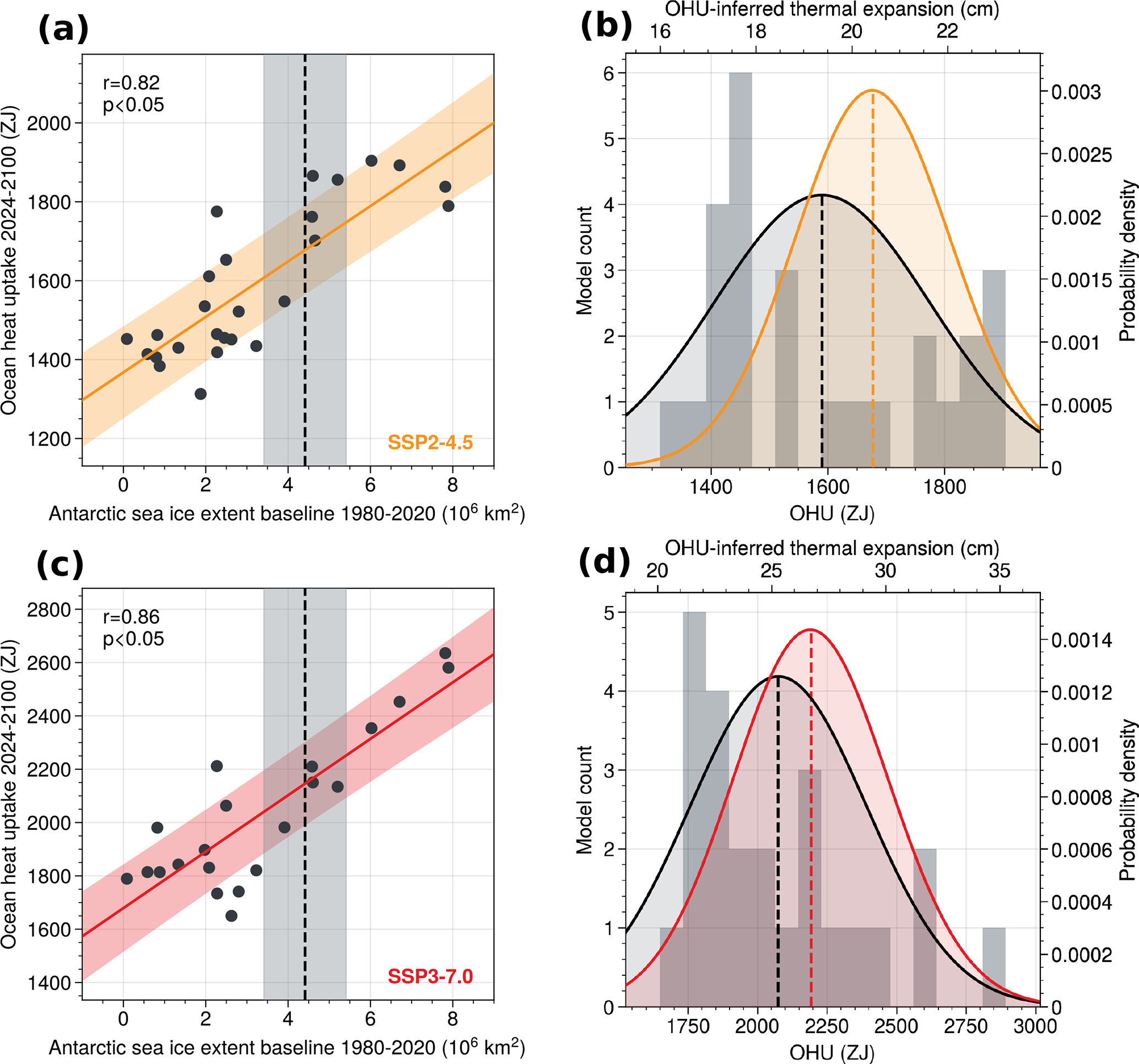 Figure 7Emergent constraint on future global ocean heat uptake. (a) Inter-model relationship between 1980–2020 Antarctic summer (January–February) sea ice extent and cumulative global OHU over 2024–2100 under the SSP1-2.6 scenario. The blue line and shading show the least-squares linear regression fit and its uncertainty (see Methods), with the Pearson's correlation coefficient r and the two-sided p value given in the upper-left corner. The dashed vertical line shows satellite observations of Antarctic summer sea ice extent averaged over 1980–2020 (OSI SAF, 2017), and the gray shading shows the associated uncertainty of 1×106 km2; this relatively large observational uncertainty ensures we derive a conservative emergent constraint (Methods). (b) Unconstrained prior (black) and constrained posterior (blue) probability density functions of 2024–2100 global OHU. In gray, we show the prior histogram for 2024–2100 OHU (Methods). (c) Same as panel (a) but for the SSP5-8.5 scenario. (d) Same as panel (b) but for the SSP5-8.5 scenario.