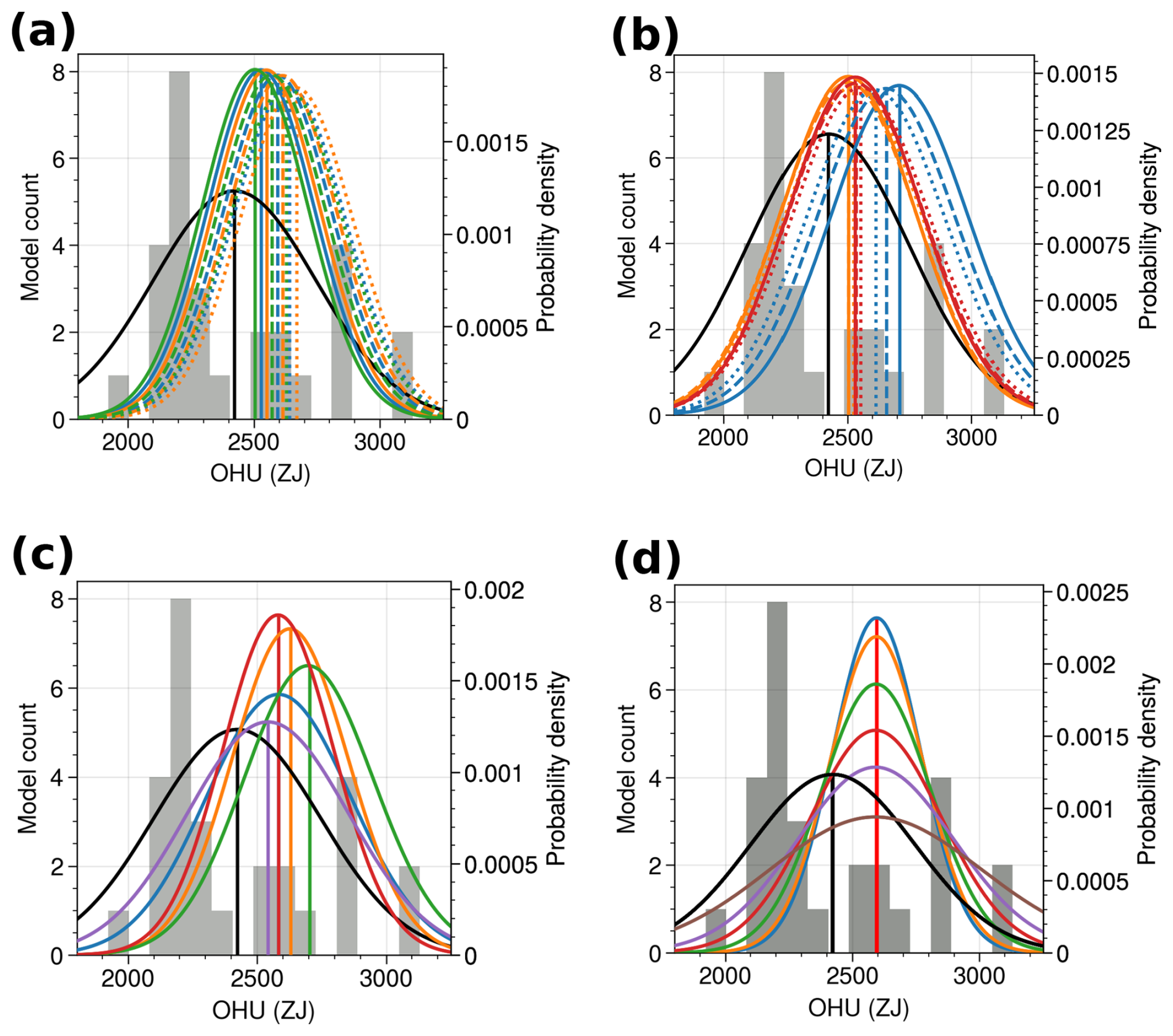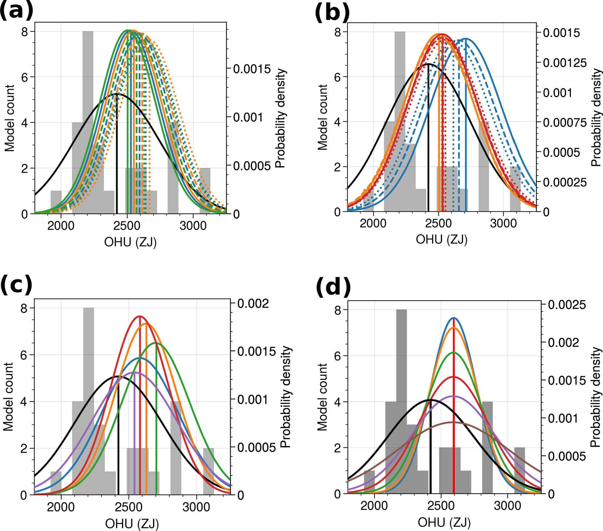 Past and future OHU are defined as OHU over the periods 1850–2023 and 2024–2100, respectively. Since the CMIP6 historical scenario covers 1850–2014 and the SSP scenarios start from 2015, the historical OHU is extended until 2023 using the SSP5-8.5 scenario. We chose SSP5-8.5 because it is the scenario for which most models provide results and because differences across SSP experiments are small over the 2015–2023 period (Riahi et al., 2017).
