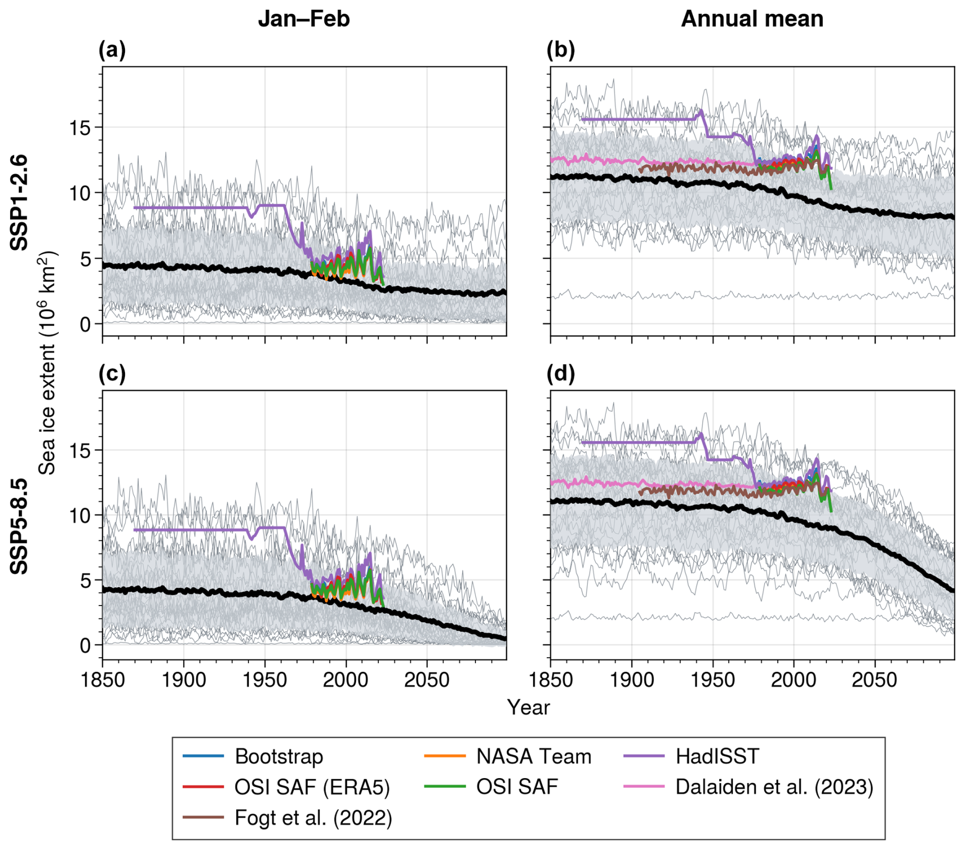 Our principal source of sea ice extent observations for use in the emergent constraint is the OSI SAF Sea Ice index (OSI SAF, 2024), which is based on Advanced Microwave Scanning Radiometer (AMSR) and Special Sensor Microwave Imager/Sounder (SSMIS) instruments, with daily data available starting in 1978. For the sensitivity analysis (Fig. A9), we use two additional satellite microwave radiometry products covering the period 1978–2023 (the NASA Team (DiGirolamo et al., 2022) and Bootstrap (Comiso, 2023) products), along with reconstructions of past sea ice extent from HadISST2.2 (Titchner and Rayner, 2014; Hobbs et al., 2016) and two recent studies (Fogt et al., 2022; Dalaiden et al., 2023).