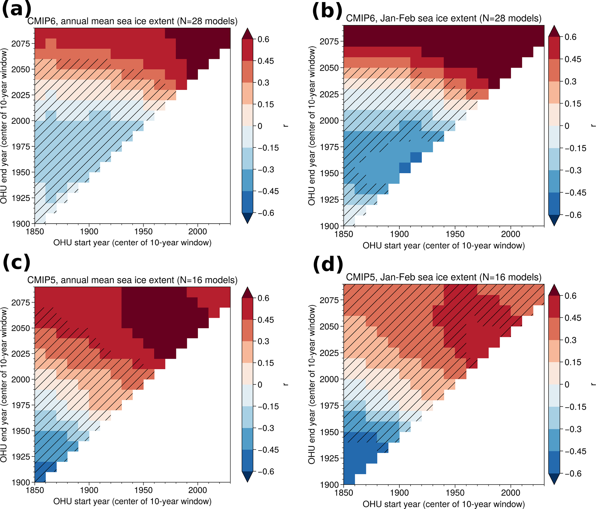 For further robustness testing, we examine the correlation between historical sea ice extent and future OHU (Fig. 7a,c) in an out-of-sample test using 16 models from the CMIP5 ensemble, and we probe the sensitivity of this correlation to the chosen OHU time period and sea ice seasonality in both CMIP5 and CMIP6 ensembles (Fig. A11). In the CMIP6 ensemble, maximal correlation between historical sea ice extent and future OHU under SSP5-8.5 is obtained for summer sea ice extent together with an OHU time period starting at any year after 1850 and ending after approximately 2070 (Fig. A11a–b). For time periods ending prior to 2030, the correlation becomes statistically insignificant, underlining the fact that the mechanism underlying the emergent relationship occurs only under future forcing. In the CMIP5 ensemble, correlations are higher for annual mean sea ice extent, but the temporal structure is similar to CMIP6, with maximal correlations for OHU periods extending towards the end of the 21st century (Fig. A11c–d).