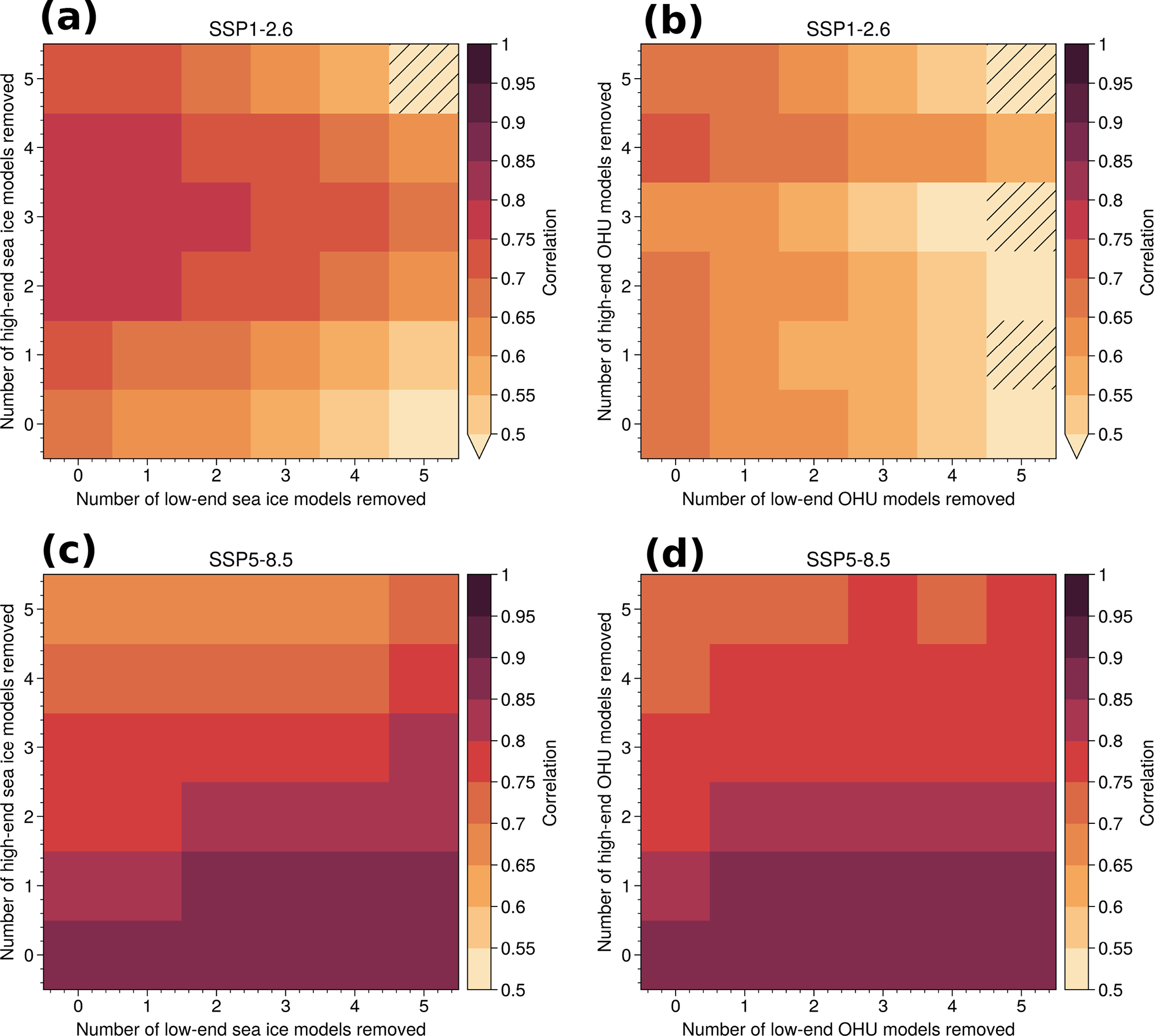 The correlation between historical sea ice extent and future OHU is not an artifact of outliers or caused by individual model values of sea ice extent or OHU far from the center of the multi-model distribution (Fig. A12). A significant positive correlation persists across all considered SSPs even when discarding several models with the highest or lowest values of sea ice extent (Fig. A12a, c) and OHU (Fig. A12b, d). Furthermore, using a Huber loss function instead of ordinary least squares (OLS) in order to reduce the influence of outliers yields an almost identical regression slope ( ZJ km−2 for OLS, ZJ km−2 for Huber) and coefficient of determination (r2=0.75 for both methods under SSP5-8.5).