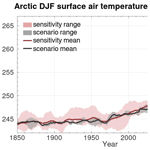 The sensitivity experiments consistently warm more than the baseline experiments, as seen by comparing the colored and black lines in Fig. 1a and c. Moreover, there is a notable difference between the sensitivity experiments that undergo the largest and smallest warming; by 2100, this difference is 4.59 K for the annual mean and 8.99 K for winter (red numbers and vertical bars to the right of Fig. 1b and d), which is almost as large as the ScenarioMIP warming range (6.9 and 10.6 K; black numbers and vertical bars). The influence of the model updates is not only evident for the future projections, but can also be seen in the pre-industrial climate (as represented by the years 1850–1900 in Figs. 1 and S1), where the sensitivity experiments have more pronounced spread than the three historical members (compare red and gray shading).
