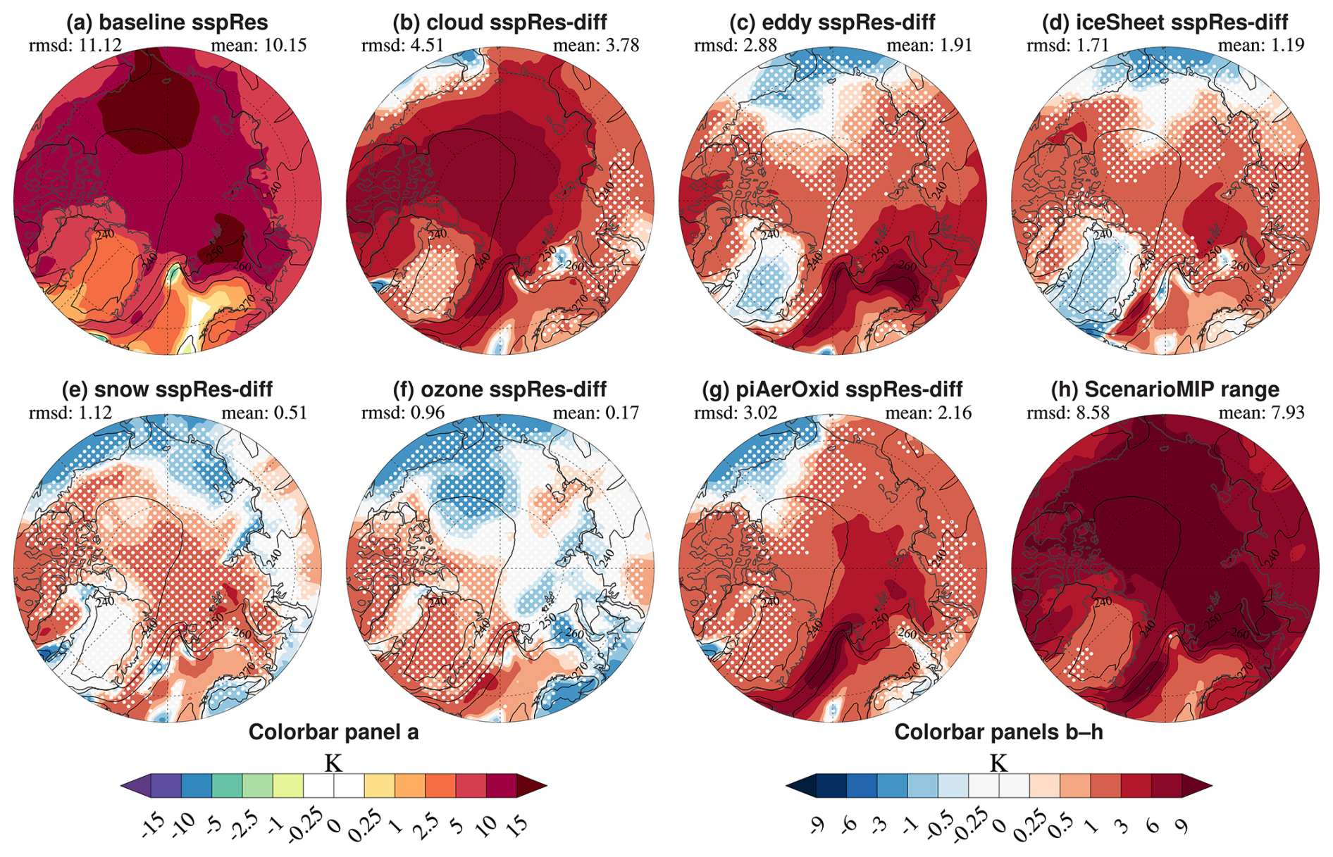 Figure 2Spatial distribution of the future change in Arctic surface temperature (colors) during winter for the future response (sspRes; Table 2) for the baseline experiments (a) and the future response difference (sspRes-diff; Table 2) for cloud (b), eddy (c), iceSheet (d), snow (e), ozone (f), piAerOxid (g), and the ScenarioMIP range (ssp585  ssp126; h). The area average (mean) and the root-mean-square-difference (rmsd) of the field shown (colors) are given in the upper-right and upper-left corners of each panel. Note that the 30-year-based mean value for the ScenarioMIP warming range shown here is slightly smaller than the warming range of the year 2100 in Fig. 1d (10.6 K) in line with temperatures generally increasing over the 21st century, rendering 2100 the warmest year on average. Selected contours from the historical baseline climatology (solid black lines) are shown for reference. White dots indicate non-significant changes according to a two-sided t test. Note that we use different color scales and contour levels for panel (a) (left color bar) and panels (b)(h) (right color bar) and that the contour levels are non-linear. Units are in K.
