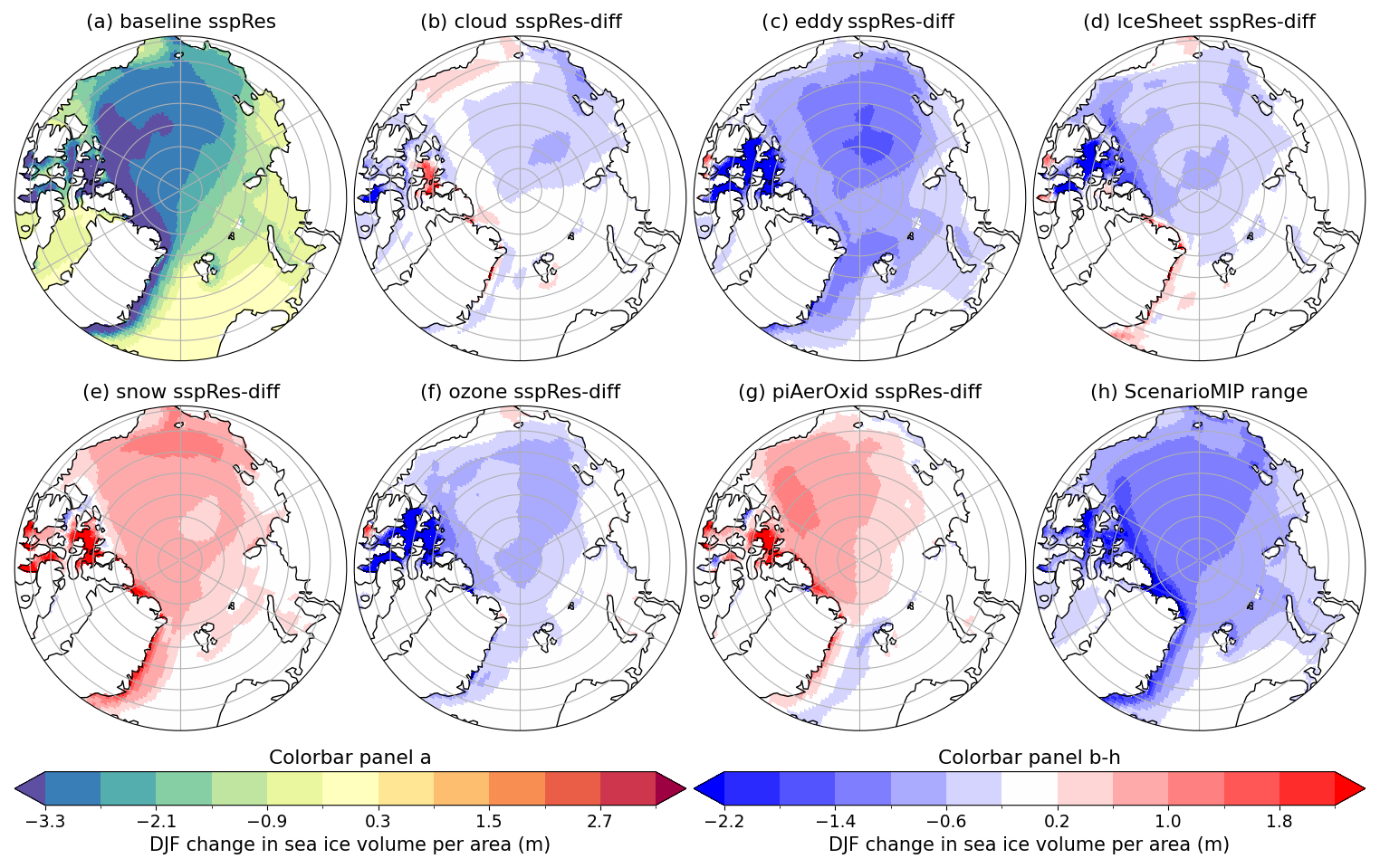 Figure 5Spatial distribution of future changes in sea ice volume during winter for the future response (sspRes; Table 2) for the baseline experiments (a) and the future response difference (sspRes-diff; Table 2) for cloud (b), eddy (c), iceSheet (d), snow (e), ozone (f), piAerOxid (g), and the ScenarioMIP range (ssp585  ssp126; h). Units are in volume per unit area (m).