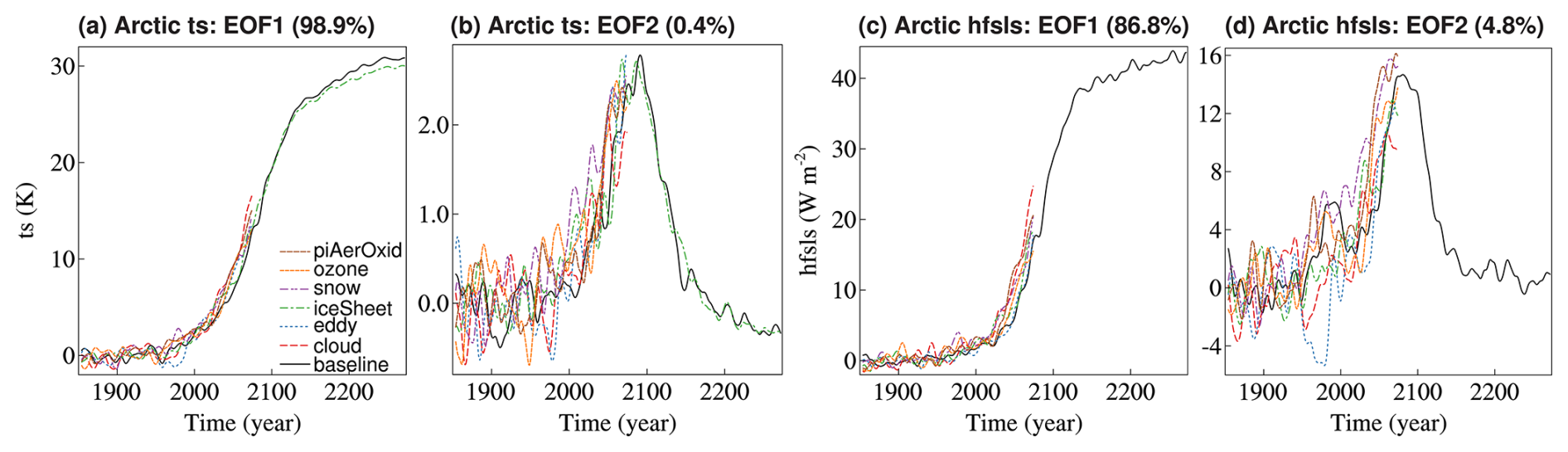 The future surface warming in the sensitivity experiments exhibits variations in space (Fig. 2) and time (Fig. 1). To explore the dominant patterns and characteristics of these variations, we use Empirical Orthogonal Function (EOF) analysis. The leading EOFs of surface temperature and other fields were identified in the baseline experiment using the entire period, 1850–2300 (historical + ssp585 + extension to 2300). The corresponding modes of variability in the sensitivity experiments were obtained by projecting anomalies of the same fields, taken over the period 2000–2100, onto the baseline EOFs. This analysis was performed both for the Arctic, north of 66° N, and for the NH extratropics, north of 20° N. The fields analyzed are surface temperature and the surface heat flux (the sum of the surface latent and sensible heat fluxes). The EOF analysis was carried out on winter means, with a 10-year low-pass filter and spatial smoothing with a scale of approximately 500 km.