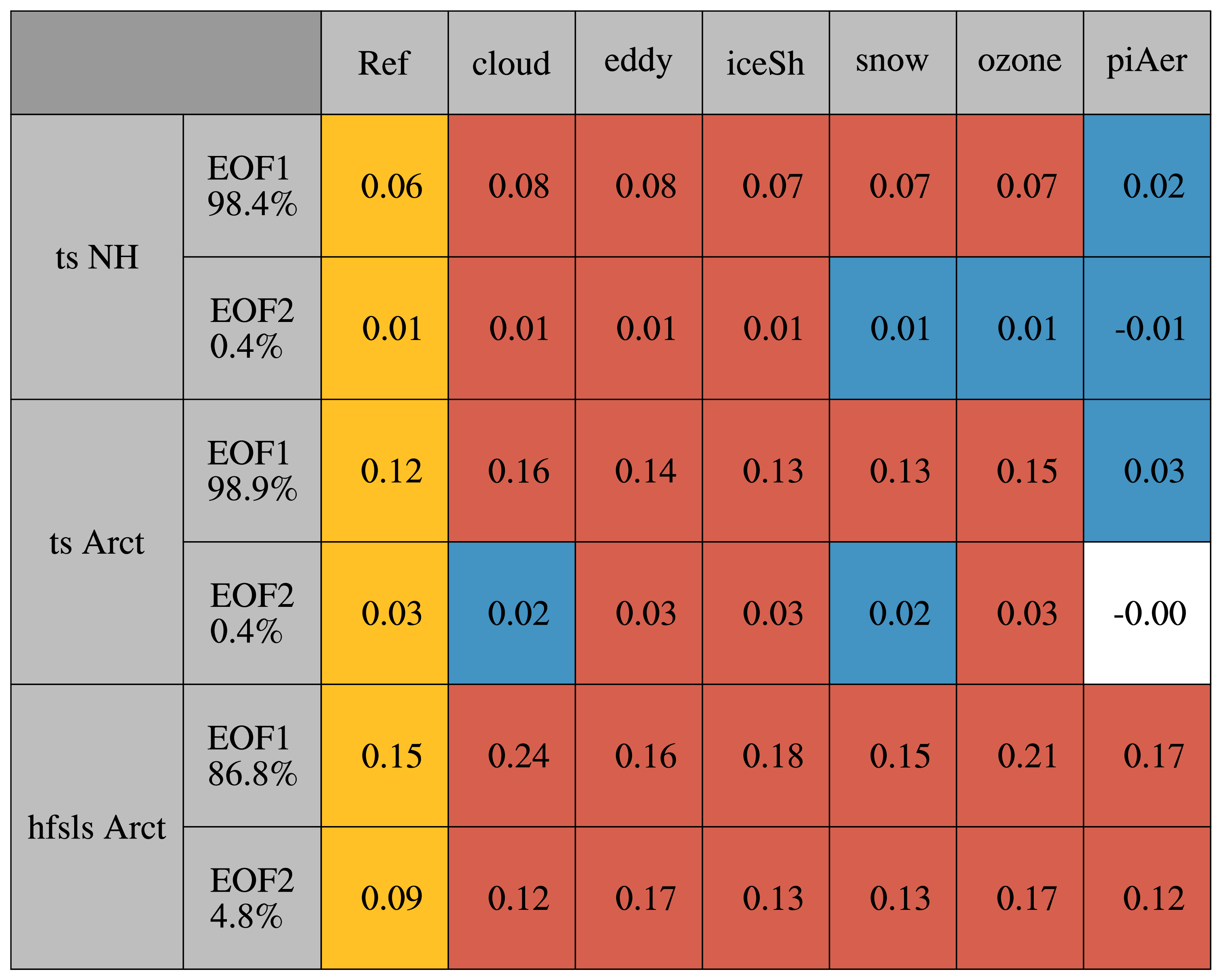 Differences between experiments are more easily seen in Fig. 9, which shows the trends over the time period 2000–2100 and their significance (in terms of the signal-to-noise ratio (SNR)) for the different EOFs. The sensitivity experiments generally exhibit enhanced warming towards equilibration (EOF1) over the period 2000–2100 compared to the baseline experiment (red cells in Fig. 9), while their transient warming pattern (EOF2) may be amplified or suppressed according to the experiment (red or blue cells). The most rapid Arctic warming towards equilibration (EOF1) is found in the cloud experiment, suggesting that it would saturate at a warmer equilibrium temperature than the baseline. The only experiment exhibiting slower warming than the baseline for EOF1 is piAerOxid. Arctic EOF2-related warming is stronger than the baseline in some experiments (eddy, iceSheet, ozone) but weaker in others (cloud, snow). It is possible that the weaker warming in cloud and snow is due to the longer equilibration timescales in these experiments, but this cannot be assessed due to the duration of the experiments (1850–2100).