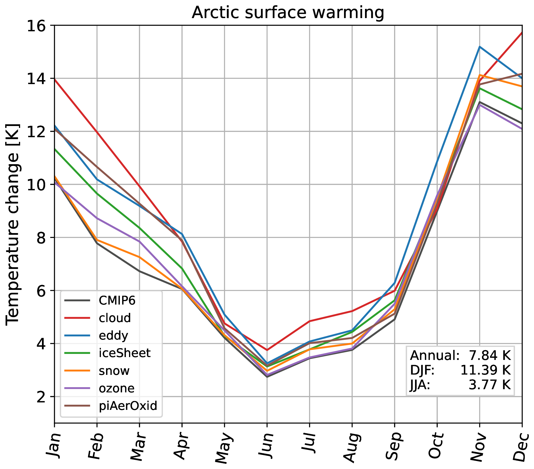 Arctic amplification was identified more than 1 century ago (Arrhenius1896) and has since been attributed to several key processes. A well-known contributor is the loss of sea ice and snow (e.g., Screen and Simmonds2010; Serreze et al.2009; Previdi et al.2021), associated with a positive ice–albedo feedback and an increase in the heat fluxes from the ocean to the atmosphere during winter. Other key processes include increased poleward transport of heat, both in the atmosphere and ocean, and the non-uniform warming of the troposphere, with stronger warming at lower levels in the Arctic enhancing surface warming through the lapse-rate feedback (e.g., Pithan and Mauritsen2014; Feldl et al.2020; Previdi et al.2021).