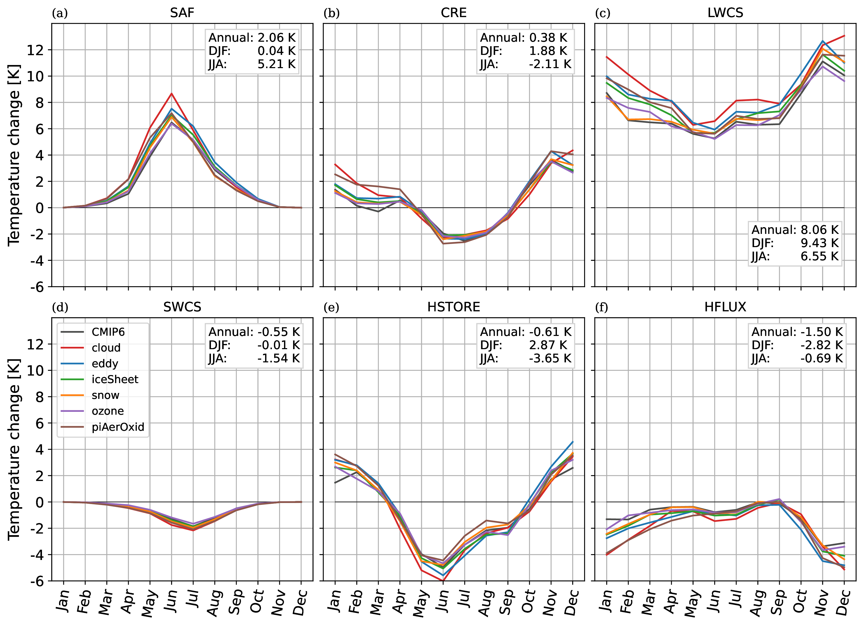 Results show that all sensitivity experiments are characterized by enhanced future surface warming in the Arctic by the end of the 21st century compared to the warming in the baseline CMIP6 experiments (ssp585-historical). The end-of-the-century range of warming across the sensitivity experiments is moreover comparable to the ScenarioMIP warming range, defined as the difference between ssp585 and the SSP corresponding to increased radiative forcing of 2.6 W m−2 (ssp126; O'Neill et al.2016). To identify and better understand the key drivers of this large warming range, we decompose the change in surface temperature following Lu and Cai (2009) and Boeke and Taylor (2018) and explore the most important processes associated with the dominant drivers.