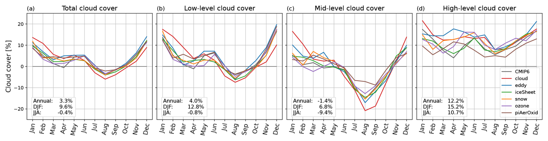 The historical experiment with the cloud changes (hist-cloud) started directly from the end of the spin-up experiment that was carried out for the CMIP6 baseline experiments (hereafter referred to as the baseline spin-up), which is a well-balanced state with negligible drift (Seland et al.2020b). The scenario (ssp585-cloud) started from the end of hist-cloud.