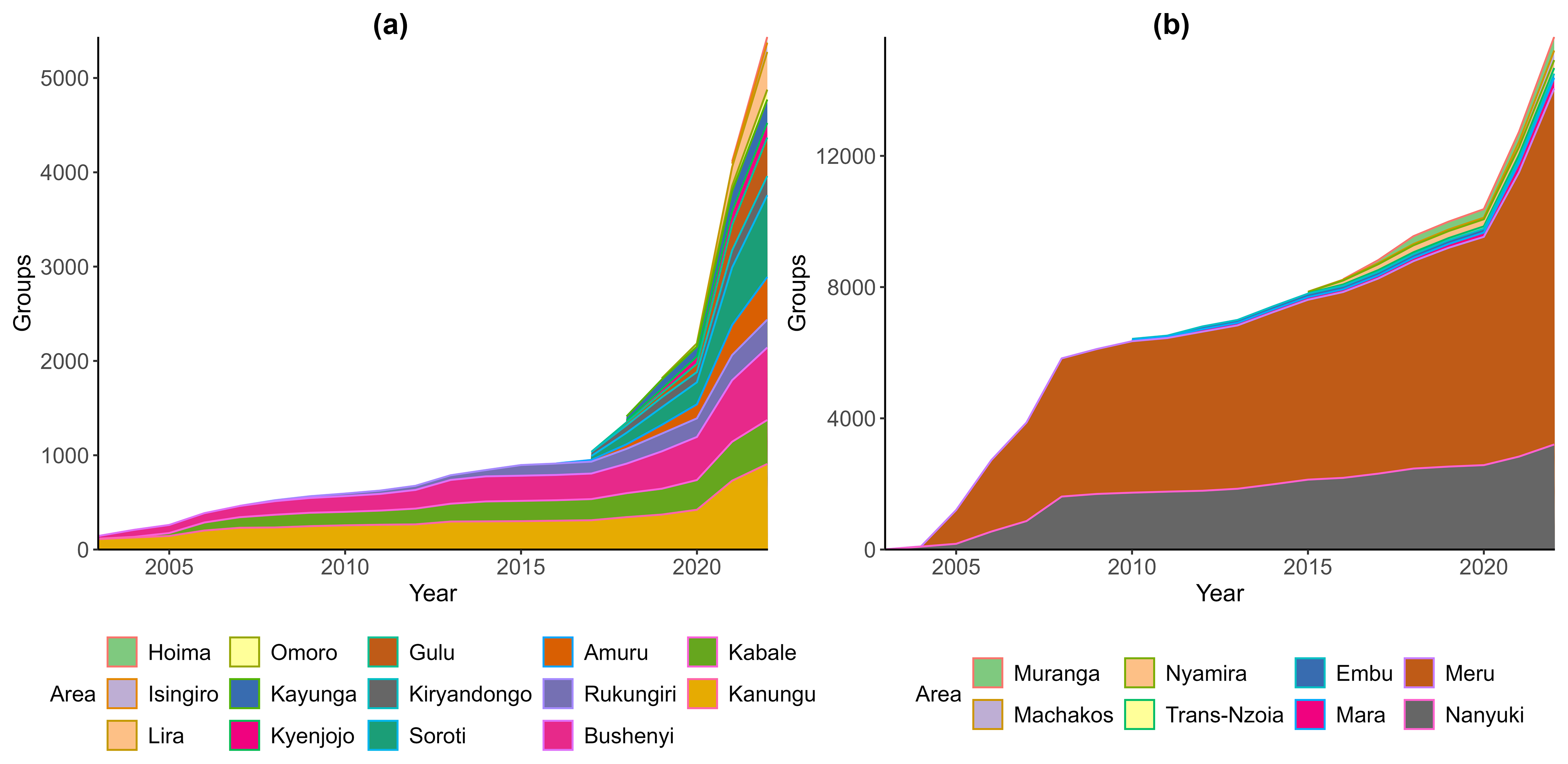 Figure 2 shows variation in enrolment across different sites, thus highlighting the contextual nature of scaling and hinting on the need to address each scaling challenge on a case-by-case basis. In Kenya, participant enrolment rates in the Meru and Nanyuki project areas overshadow all the other sites in the country and shape the national enrolment picture, while in Uganda, the programme expanded to several new project areas after 2015, with some (Soroti, Gulu, Amuru, and Lira) achieving high rates of enrolment comparable to the older sites. For instance, of the five sites with the highest number of groups in Uganda, three sites are less than 8 years old as of 2025, and among these Soroti has the second-highest enrolment rate of all the sites in the country.