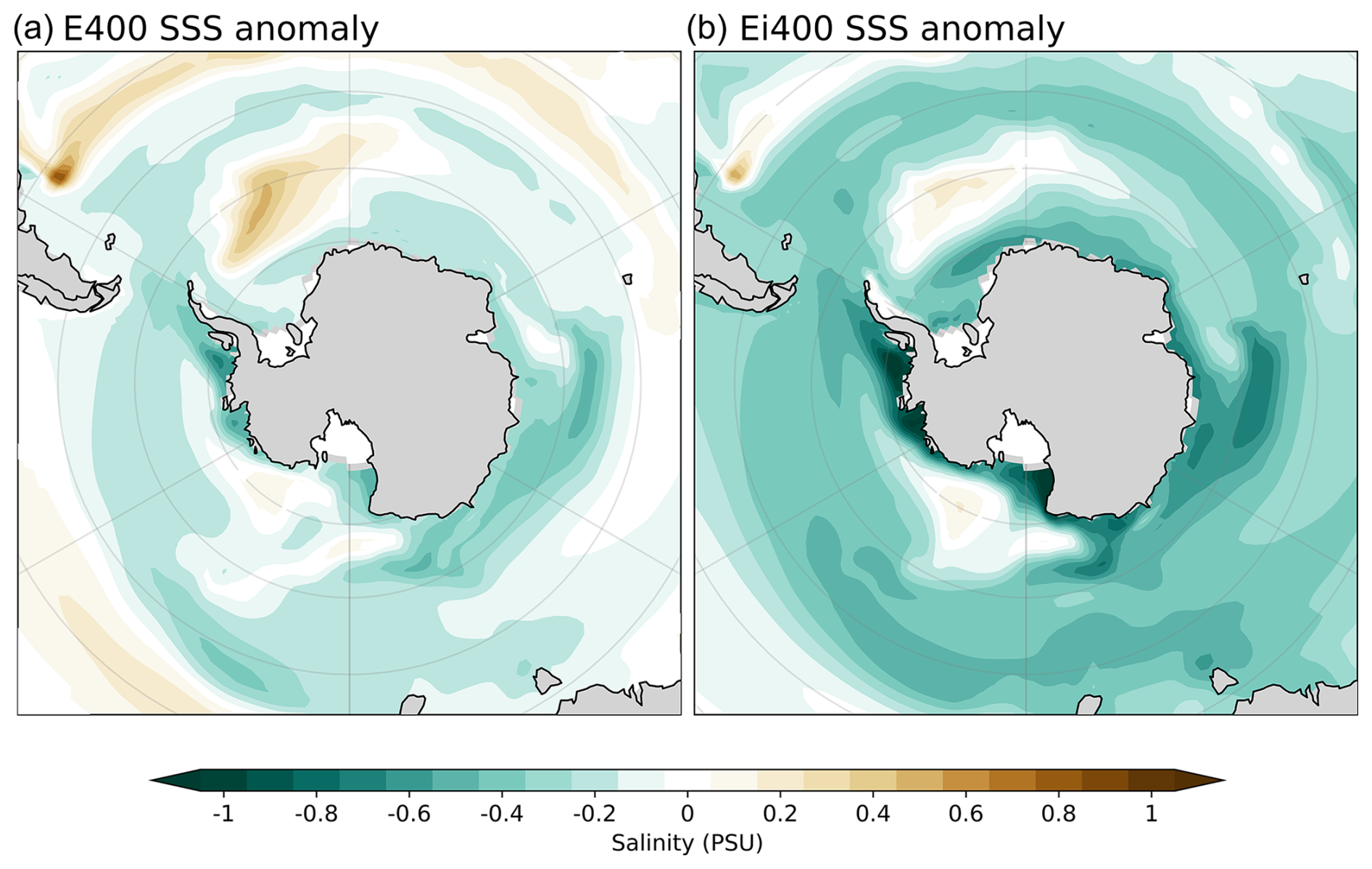 With warming of the Earth's surface leading to an extensive sea ice melt (Fig. 2e and f), the surface layer of the Southern Ocean undergoes substantial freshening around the Sea Ice Zone (SIZ), which is highly sectorised. In E400 (Fig. 6a), the Bellinghausen and Davis seas exhibit the highest freshening, whereas the region encircling the APF (north of 55° S), the wind-driven outcrop of the Circumpolar Deep Water (CDW) in the Weddell gyre, and some parts of the Ross Sea exhibit upper-ocean salinisation. Conversely, with the stronger reduction in sea ice concentration that is imposed by reducing the ice sheet extent (Ei400), the surface freshening of the Southern Ocean is amplified (Fig. 6b), while the salinisation in the outcrop region of the CDW, in the Ross Sea, and outside the APF remains, albeit at a much reduced magnitude.
