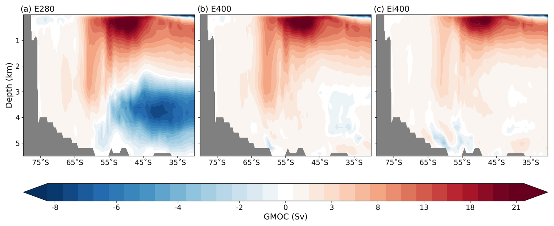 As the changes in the sea surface temperature and salinity, which are amplified in Ei400 with respect to E400, impose contrasting effects in the ocean interior, the Southern Ocean Meridional Overturning Circulation (SMOC) undergoes a major shift (Fig. 8), particularly with respect to the strength of the AABW, which is essential for the ventilation of the global ocean (Orsi et al., 1999). Firstly, the SMOC reveals two major cells in E280: a clockwise cell that represents the northward flow of surface waters and the return flow of deep and intermediate waters that upwell at around 60° S and an anticlockwise cell that represents the northward flow of the AABW towards Indo-Pacific and Atlantic basins (Talley et al., 2016). In E400, the clockwise cell deepens and the AABW is significantly weakened from 8–2 Sv. In Ei400, on the other hand, the clockwise cell weakens and shoals, while the AABW exhibits a slight strengthening of about 2 Sv.