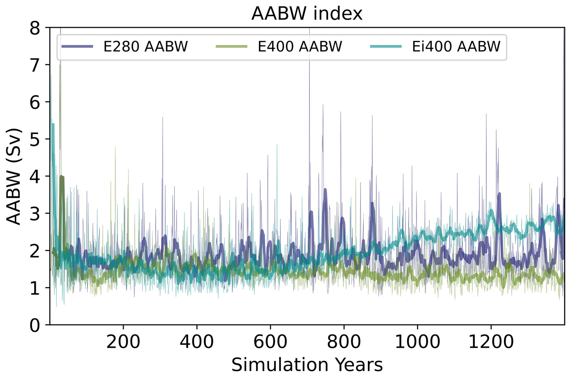 Considering the mean state of the last 200 simulation years, we therefore see that the AABW undergoes extensive weakening in both sensitivity simulations. Such sustained weakening is consistent with the picture of freshening and warming of the upper ocean displayed in Fig. 7 but not completely consistent with the picture of salinisation of the deep ocean. To evaluate the strength and variability in AABW formation in our experiments during runtime and gain more insights into the overall state of abyssal overturning in the Southern Ocean, we derived an AABW index that consists of the absolute value of the minimum overturning south of 60° S and below 500 m depth (adapted from Zhang et al., 2019). Note that we exclude the upper 500 m from the index to isolate the water column comprising the subsurface to abyssal layers from the upper ocean and avoid capturing its high-frequency variability. The AABW index (Fig. 9) shows that, even though Fig. 8b and c indicate a similar pattern of AABW weakening in both sensitivity experiments, the evolution of the AABW strength shows a sustained weakening in E400 and a partial recovery in Ei400, particularly after simulation year 700. Additionally, in both sensitivity experiments, the variability in the AABW is significantly reduced with respect to E280. Such behaviour indicates that enhancing the atmospheric CO2 concentrations, accompanied by massively reducing the extent of ice sheets, triggers compensatory mechanisms to the initial AABW suppression, likely involving salinisation of the deep and bottom ocean, as suggested in Fig. 7.