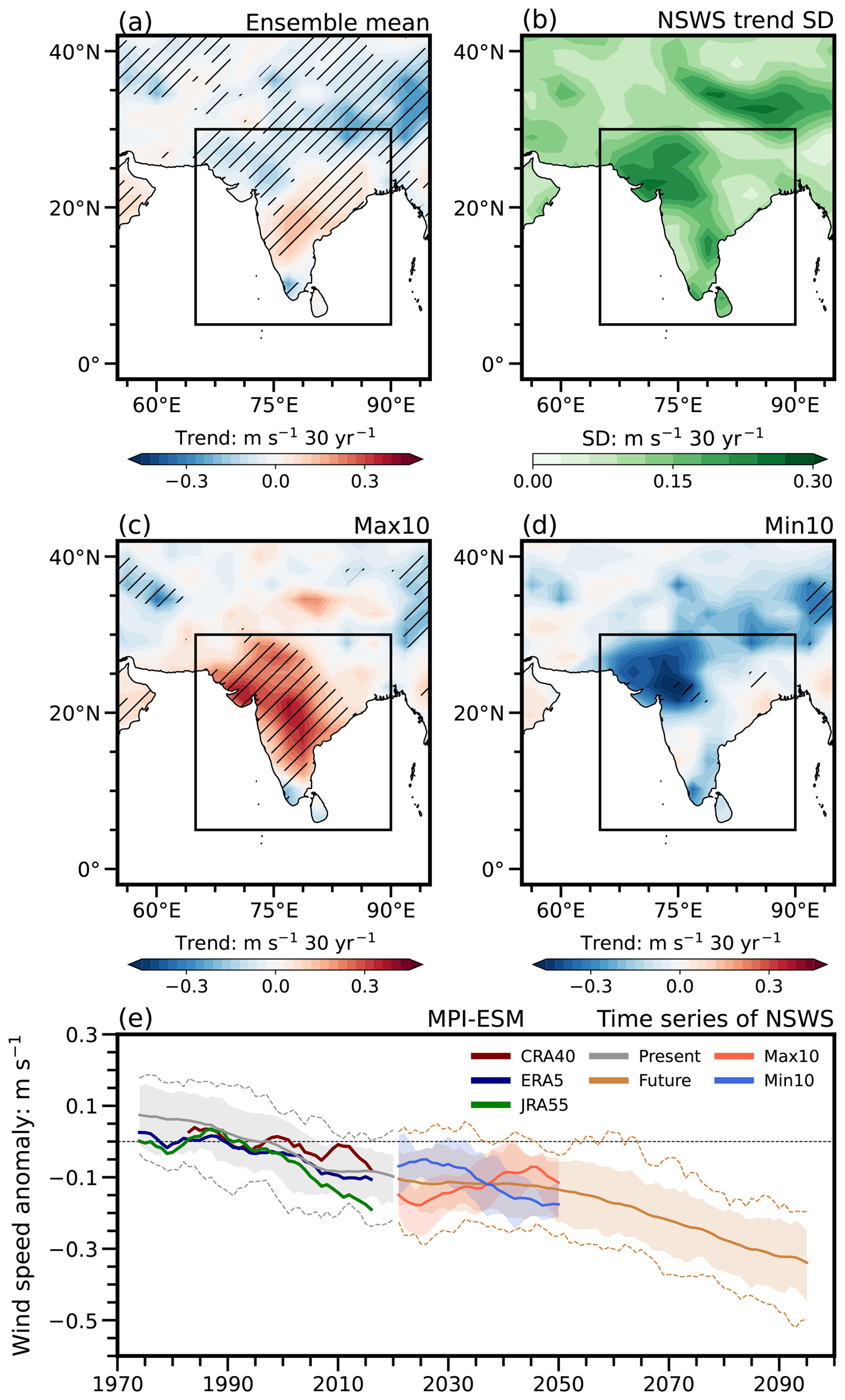 Figure 1Temporal NSWS changes over South Asia. Annual mean near-surface wind speed (NSWS) trends under the RCP8.5 scenario for (a) the 100-member ensemble mean of MPI-ESM, (b) inter-member standard deviation, (c) the mean trend of the 10 members with the highest increase in NSWS over South Asia, and (d) the mean trend of the 10 members with the highest decline in NSWS over South Asia between 2021 and 2050. Slant hatching denotes trends that passed a significance test with P<0.05. The box in (a) to (d) highlights the South Asia region (5–30° N, 65–90° E). (e) Time series of the 9-year running mean of NSWS anomalies (relative to the 1980–2010 mean). Purple, dark-blue, and green solid lines represent reanalysis data from CRA40, ERA5, and JRA55, respectively. Gray and brown solid lines represent the ensemble mean of all members of MPI-ESM for the present (1970–2020) and future (2021–2099), with light-gray and light-brown lines indicating the associated 5th and 95th percentiles. Orange and blue solid lines represent the ensemble mean of the ten simulations with maximum and minimum trends in NSWS. Dashed lines refer to the maximum and minimum ranges of MPI-ESM.