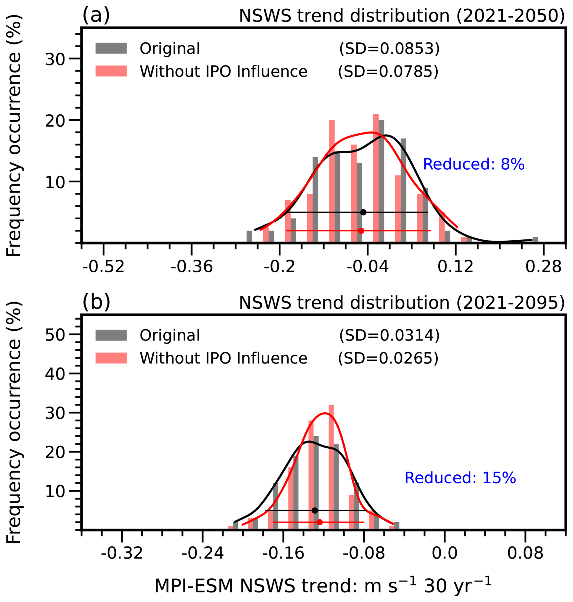 To quantify the IPO's effect on NSWS changes over South Asia in the near future, we isolated the IPO-related NSWS changes by removing the NSWS changes linearly related to the IPO index in each member (see Sect. 2.6). Histogram analysis reveals a narrowing in the distribution of NSWS trends over South Asia after removing the IPO's effect, with the standard deviation in the members' trends decreasing by approximately 8 %, from 0.09 to 0.08 m s−1 per 30 years (Fig. 5a). Although modest, these reductions suggest that the uncertainty in NSWS trend projections over South Asia could be reduced by improving our ability to predict the IPO in the future. Applying this method to far-future projections for the 21st century (2021–2095) further confirms the sensitivity of these conclusions to the selected period and underscores the significance of long-term changes, which can be compared with inter-decadal variability in the near future. As expected, by eliminating the IPO's influence, projection uncertainty is significantly reduced by 15 %, nearly double the reduction observed in the near future (Fig. 5b).