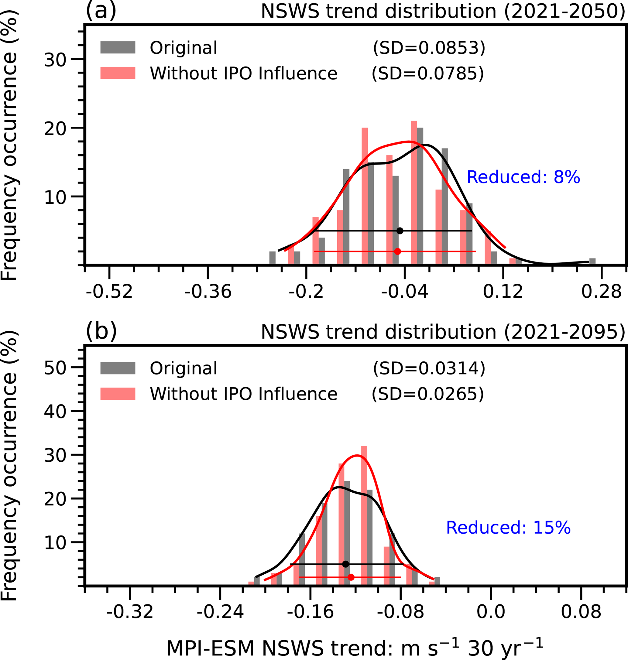 Figure 5Histograms of the NSWS trend over South Asia in the future under the RCP8.5 scenario with and without the impact of the IPO. (a) Histograms and fitted distribution lines of the area-averaged South Asian NSWS trend derived from the 100 MPI-ESM ensemble members from 2021 to 2050. The gray bars and black fitted curves show the frequency of the occurrence of NSWS trends, while the red bars and red fitted curves represent the frequency of NSWS trends with the IPO's influence removed through linear regression against the IPO index in individual runs. (b) Same as (a), but for the period from 2021 to 2095.