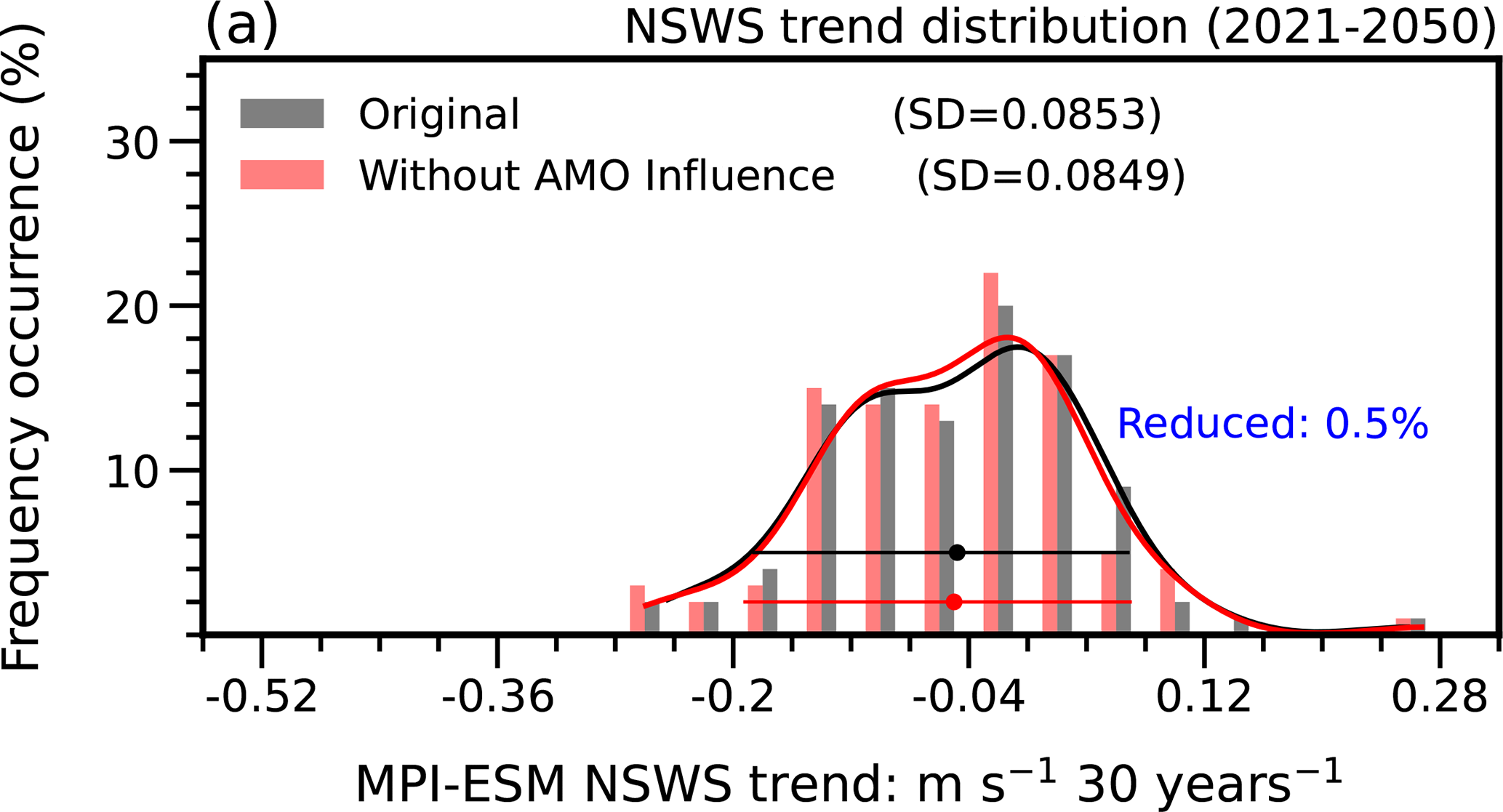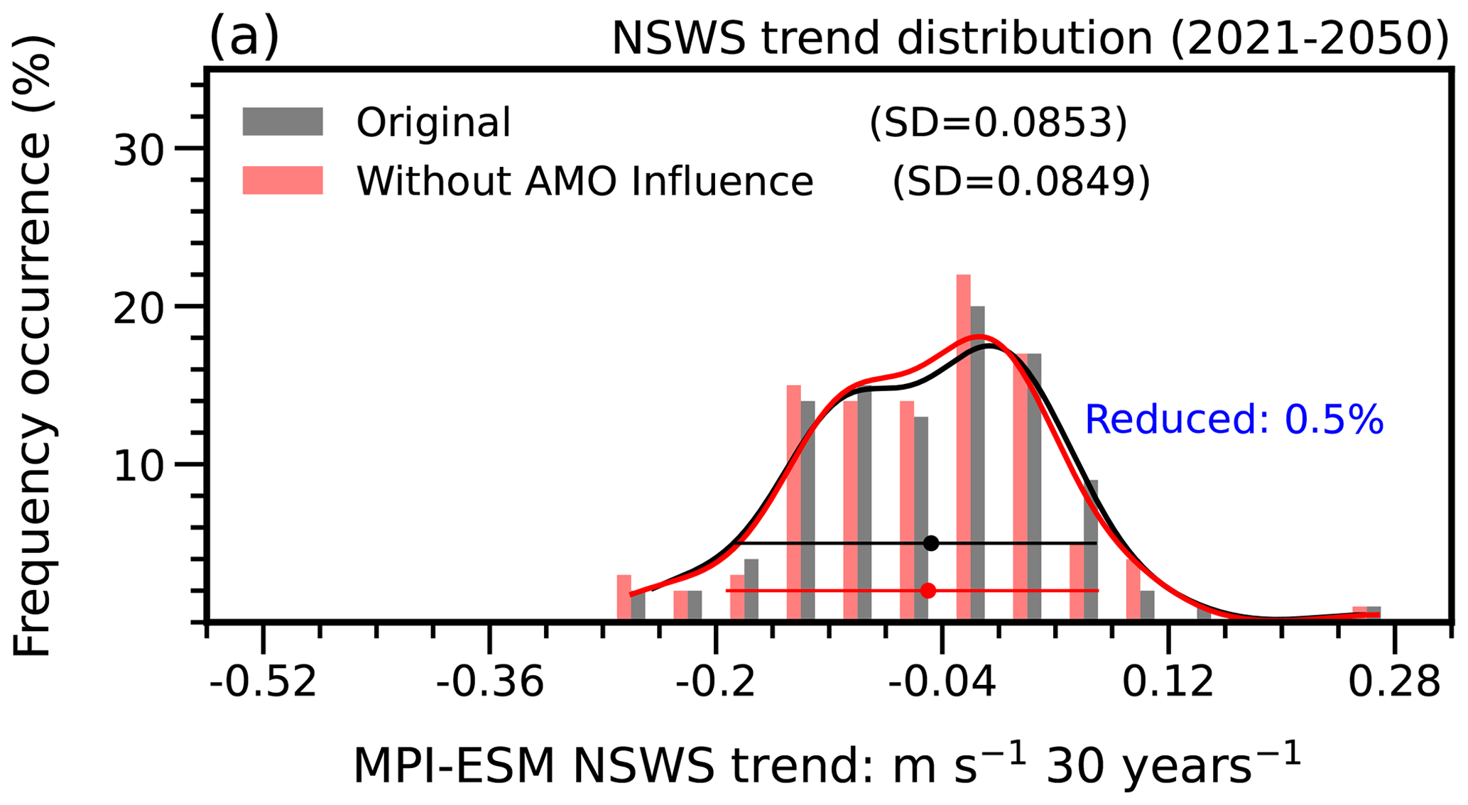 Figure 6Histograms of the NSWS trend over South Asia under the RCP8.5 scenario with and without the impact of the AMO between 2021 and 2050. (a) Histograms and fitted distribution lines of the area-averaged South Asian NSWS trend derived from the 100 MPI-ESM ensemble members from 2021 to 2050. The gray bars and black fitted curves show the frequency of the occurrence of NSWS trends, while the red bars and red fitted curves represent the frequency of NSWS trends with the AMO's influence removed through linear regression against the AMO index in individual runs.