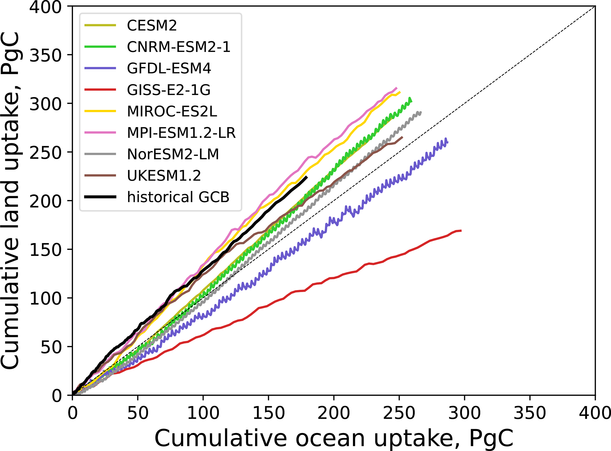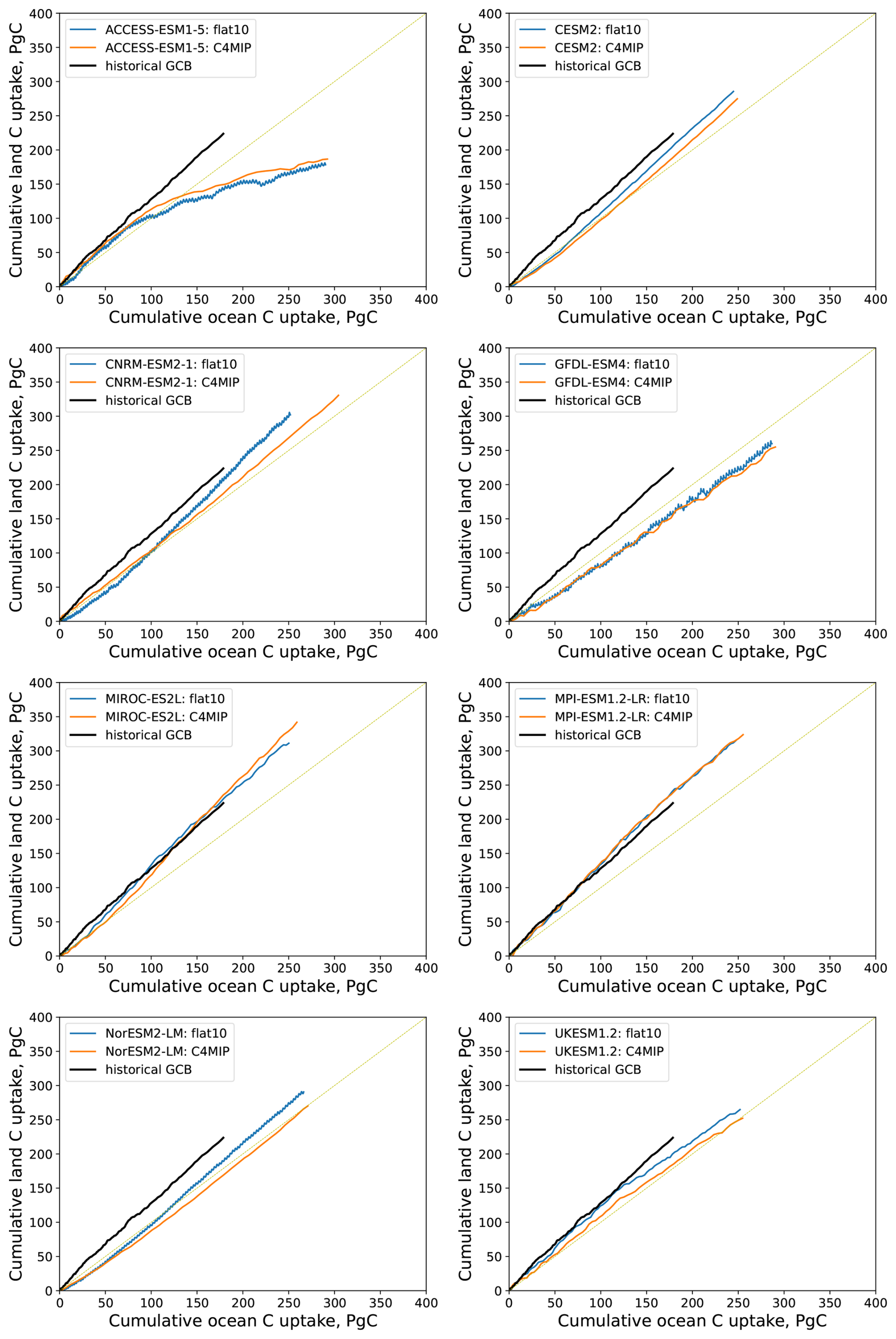 Figure 1Cumulative land vs. ocean carbon uptakes in the flat10 experiments for the first 100 years. Historical land vs. ocean carbon sinks in the Global Carbon Budget (GCB) (Friedlingstein et al.2023) for the period 1850–2022 are shown by continuous black line. The land sink in GCB is calculated from simulations in which CO2 and climate evolved over the historical period, while the land cover stayed at its pre-industrial level (no land use change). The thin dash line is the 1:1 ratio.