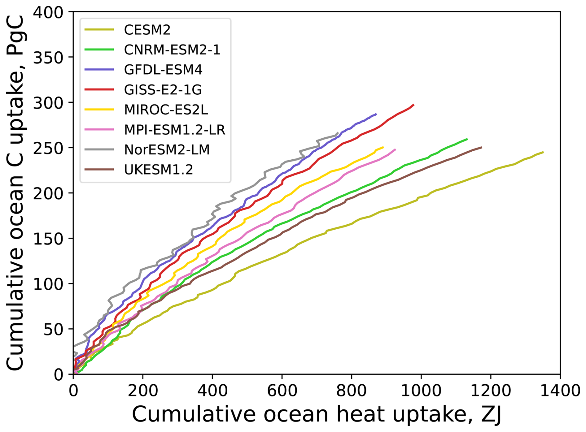 In the ocean, CO2 uptake is mainly determined by the CO2 pressure difference between the atmosphere and the surface water and by the diffusion/removal of dissolved inorganic carbon (DIC) into the permanent thermocline. With increased temperature and elevated DIC concentration, the CO2 solubility in sea water decreases and ocean uptake slows down. Changes in marine biology also affect carbon uptake, but to a lesser extent (Williams et al.2020; Seferian et al.2024; Tjiputra et al.2025). An implication of the linear relationship between cumulative land and ocean uptakes (Fig. 1) is that mechanisms either don't change much, or slow at the same rate for ocean and land. This is consistent with the notion that global rates of heat and carbon uptake by the ocean are primarily set by the background, or unperturbed, ocean circulation (Armour et al.2016; Bronselaer and Zanna2020b). This might help explain why the relation between cumulative heat and carbon uptake is scenario-independent in MPI-ESM (Fig. A2), as future rates of heat and carbon uptake are largely unaffected by changes in the ocean circulation. Whether or not ocean dynamical adjustments can break this linearity over longer timescales merits further analysis but is beyond the scope of this paper.