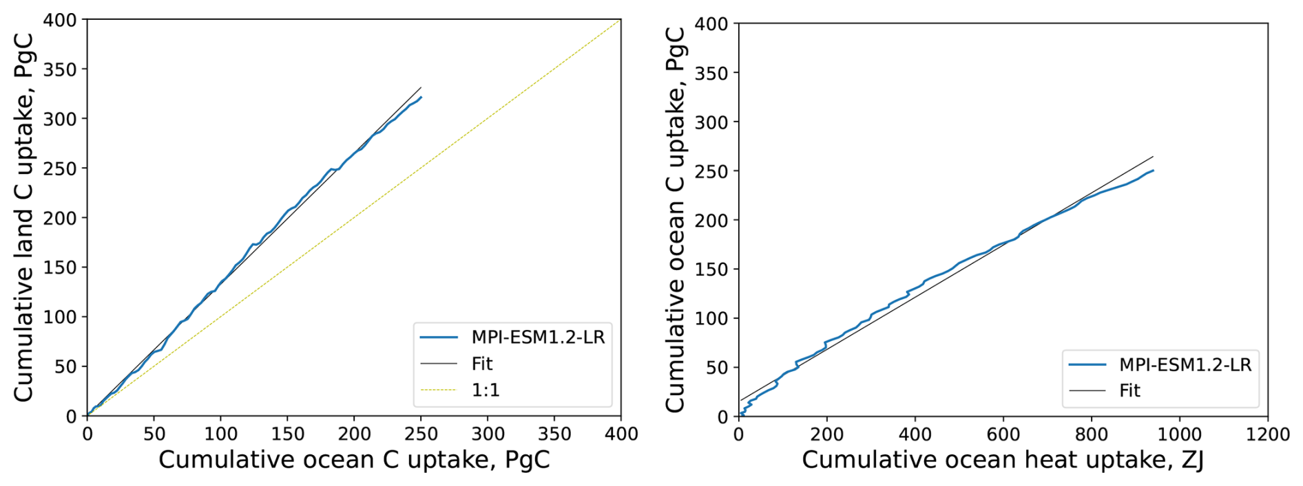The ratios of land to ocean carbon uptakes, Cl/Co, in the flat10 experiments are similar to the ratios βl/βo of the carbon–concentration feedback parameters as well as to the Cl/Co ratios at the 2xCO2 level in the C4MIP experiments of CMIP6 (Table 1). This similarity is expected, as the carbon–concentration feedback parameters βl and βo reflect an increase of land and ocean carbon pools, respectively, in response to atmospheric CO2 changes. However, the linearity of the Cl/Co ratio for the range of emissions from 0 to 1000 Pg C is unexpected. Although processes that govern land and ocean carbon uptakes are different, the link between them could be explained by increasing atmospheric CO2 concentration which is a primary forcing for both land and ocean carbon uptakes. We can apply this empirical relationship to simplify the description of carbon cycle dynamics, in particular for MPI-ESM (Fig. 3, left). Additionally, for simplicity one can assume a linear relationship between ocean heat and carbon uptake, as the processes of dissolution and transport of CO2 into the deep ocean are generally similar to the transport of heat (Figs. 2, 3, right):