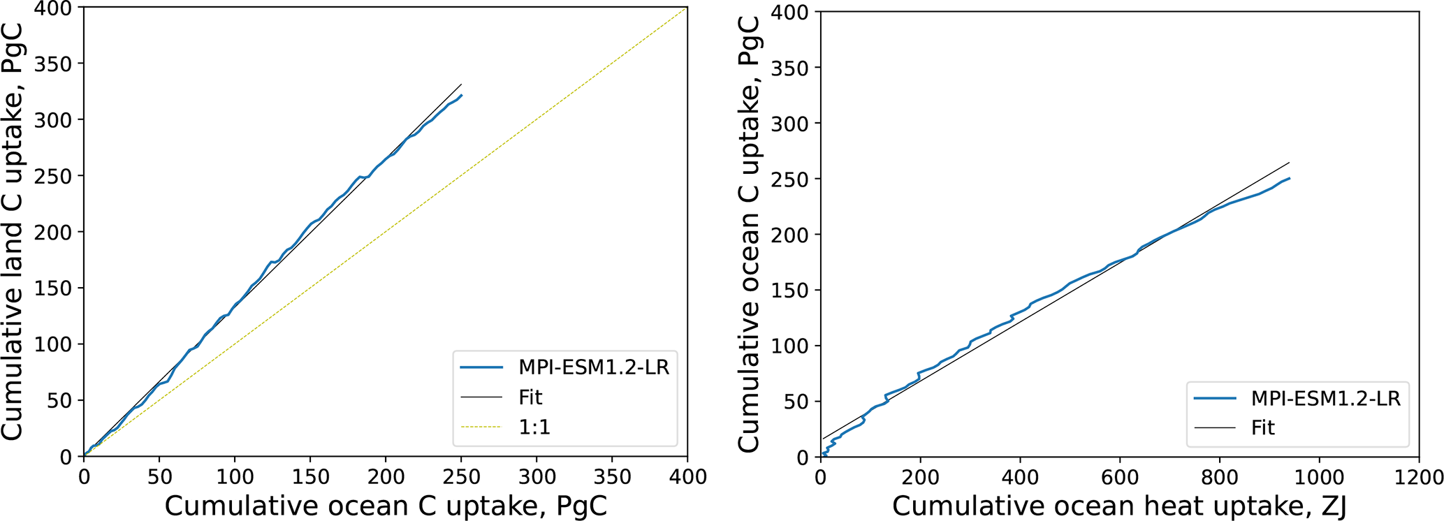 Figure 3Results of the flat10 experiment with MPI-ESM1.2-LR (blue lines). Left: dynamics of cumulative land vs. ocean carbon uptakes. Right: changes in cumulative ocean carbon and heat uptakes. Black lines are for linear fits.