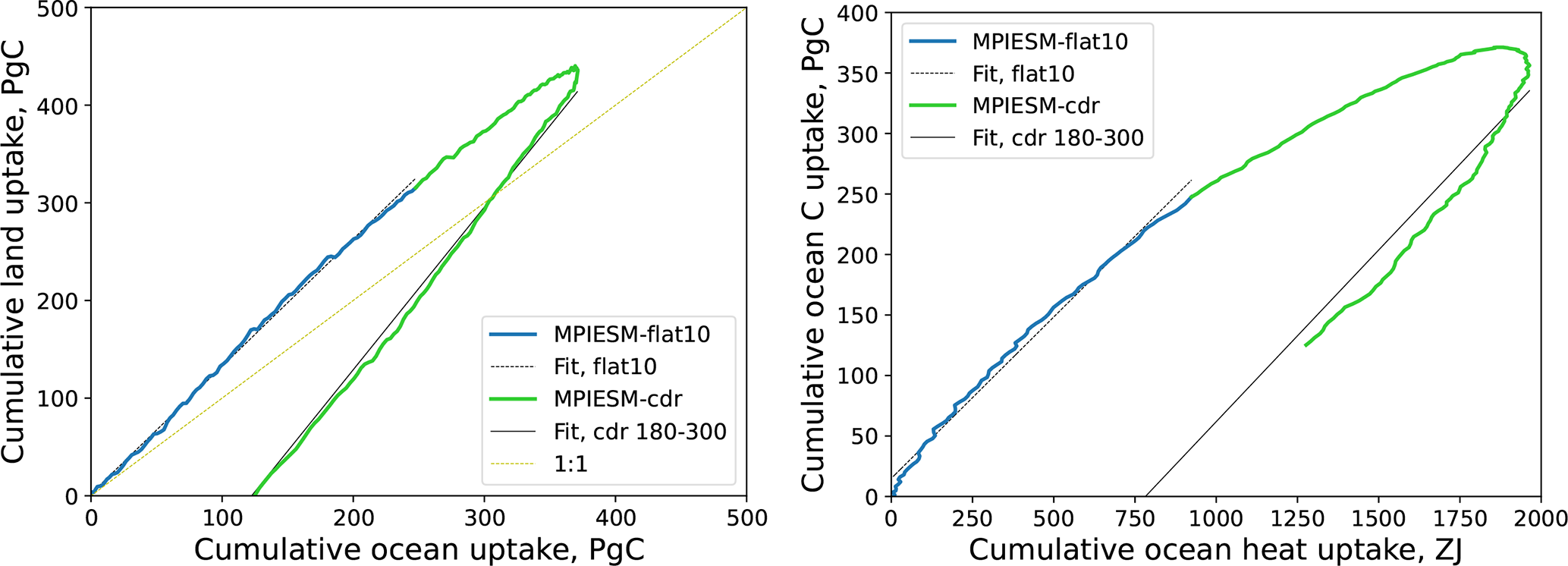 Figure 7Cumulative land to ocean carbon uptakes (left) and ocean carbon to heat uptakes (right) in the flat10 and flat10cdr experiments with MPI-ESM1.2-LR. Gray lines are linear fits for the corresponding simulations.