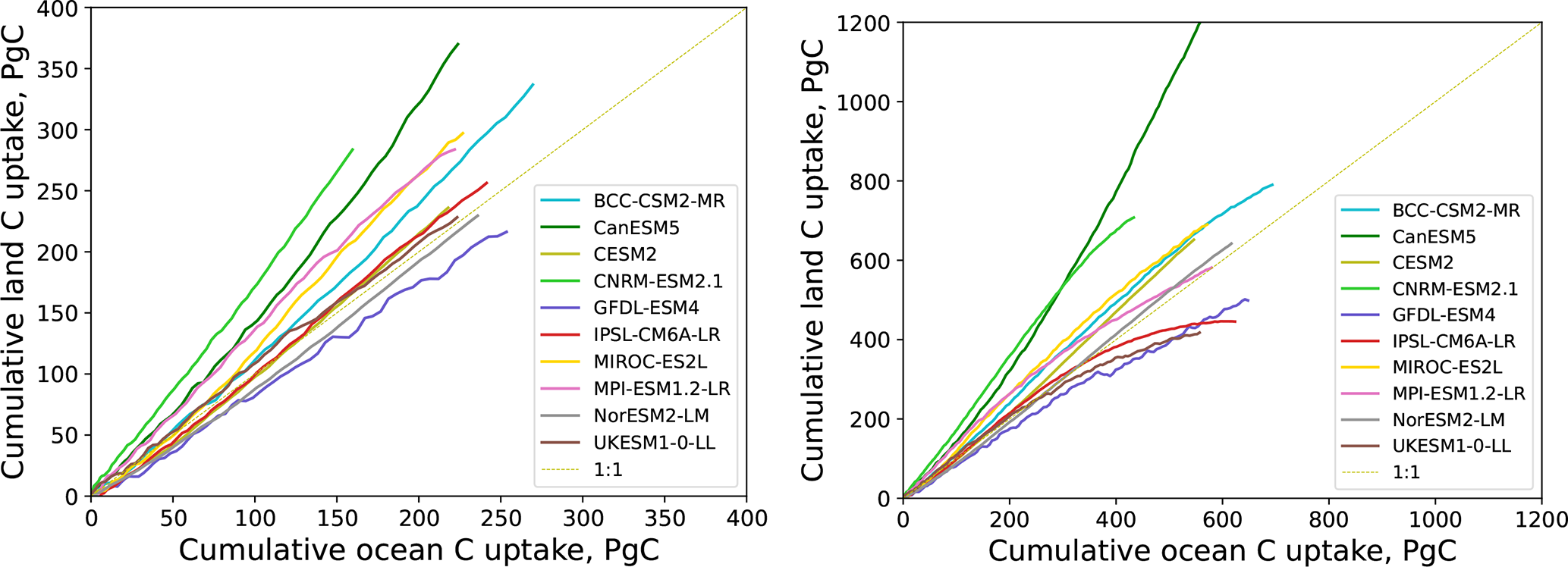 Figure A1Cumulative land vs. cumulative ocean carbon uptake in the C4MIP experiments up to 2xCO2 (left) and up to 4xCO2 levels (right), data from Arora et al. (2020).