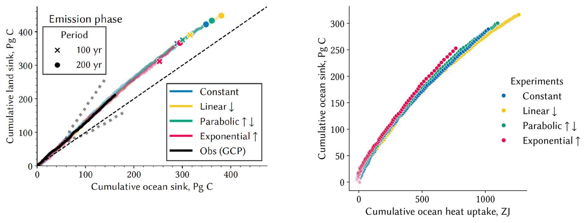 Figure A2In MPI-ESM simulations with total CO2 emissions of 1200 Pg C for 100 or 200 years, the sink shares of land versus ocean (left) emerge to keep the same relationship irrespective of pathway profiles. The same is valid for ocean carbon vs. heat uptake (right). For details, see paper by Winkler et al. (2024).