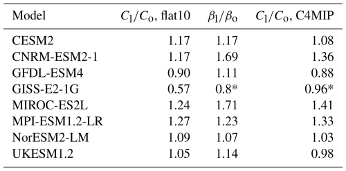 Table 1Parameters of flat10 ESMs. Left, Cl/Co=k-1, the ratio of cumulative land to ocean carbon uptakes by the year 100. For comparison with C4MIP experiments at the 2xCO2 level (Arora et al.2020): middle, ratio of βl to βo; right, a ratio of cumulative land to ocean carbon uptake.