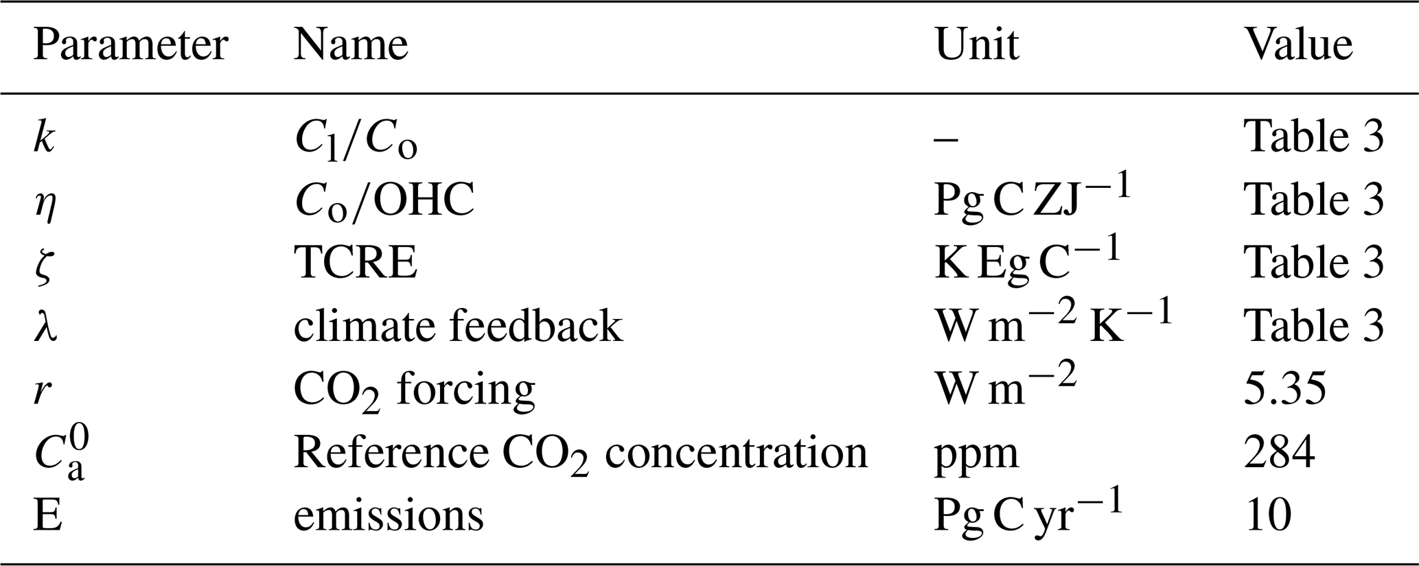 Table 3Parameters based on flat10 experiments: Cl/Co, the ratio of cumulative land to ocean carbon uptake (year 100); Co/OHC, the ratio of cumulative ocean carbon to heat uptake, Pg C ZJ−1 (year 100); TCRE, K Eg C−1 (year 100); and λ from 4xCO2 experiments (Zelinka et al.2020). Numbers in parentheses are adjusted parameters for analytical and numerical solutions.
