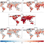 On the other hand, between the univariate extremes, TX90p (Fig. 2c) appears to show the most benefit from the initialisation, with added skill located in central and eastern Asia, Greenland and southern Australia. Additionally, we also find some added value in small parts of North America, South America and Africa. For dry extremes, the areas of added skill are more limited. SPI3dry demonstrates added skill in some small areas of South America, Asia and Scandinavia (Fig. 2d). Moreover, northern Africa also shows a homogeneous area of added skill, which, at least in part, corresponds to the significant skill observed for SPI3dry (Fig. 1d). On the other hand, SPEI3dry shows slightly fewer areas of added skill, limited to southern Australia and central Asia (Fig. 2e), the latter being similar to the region where we find added skill for TX90p.
