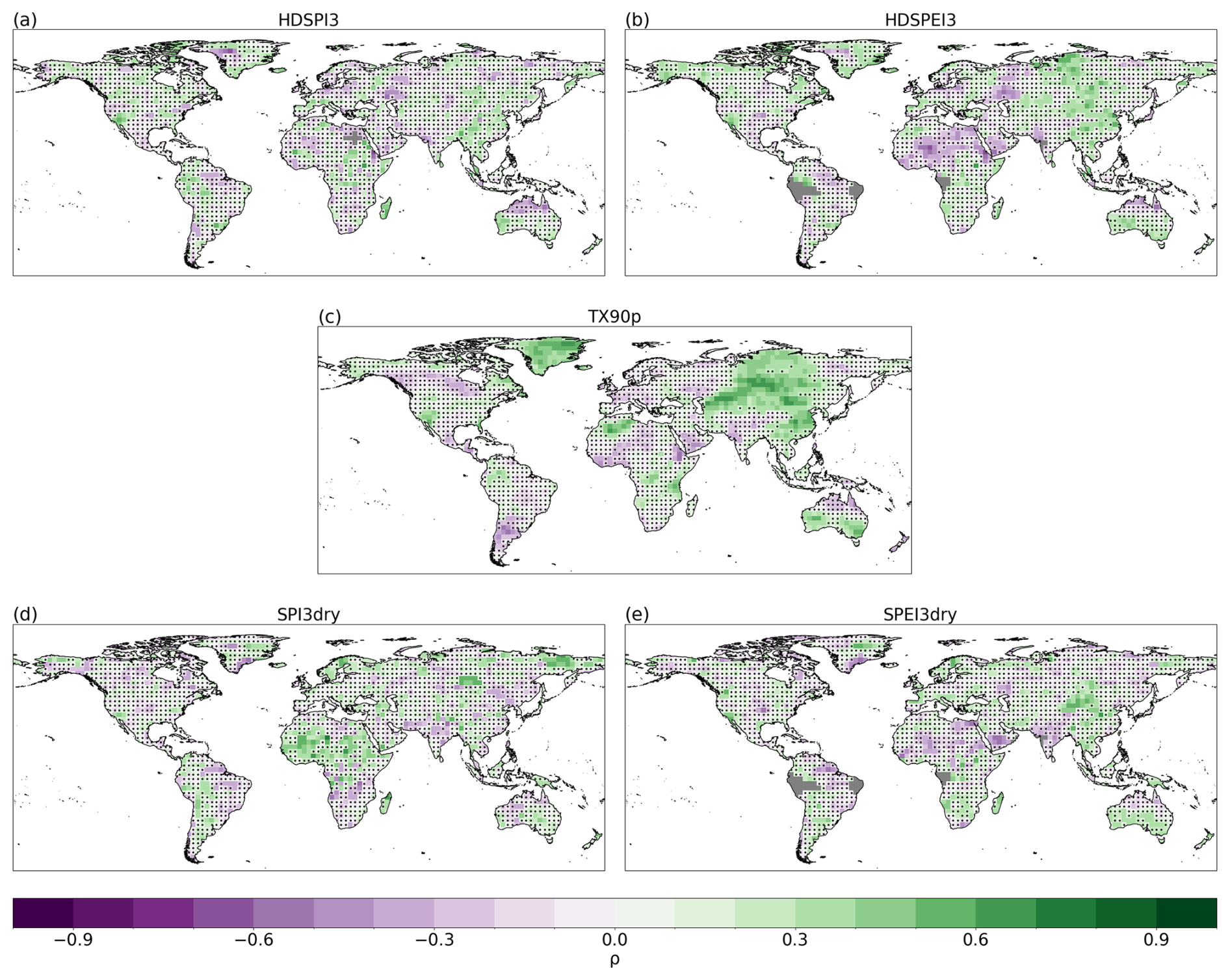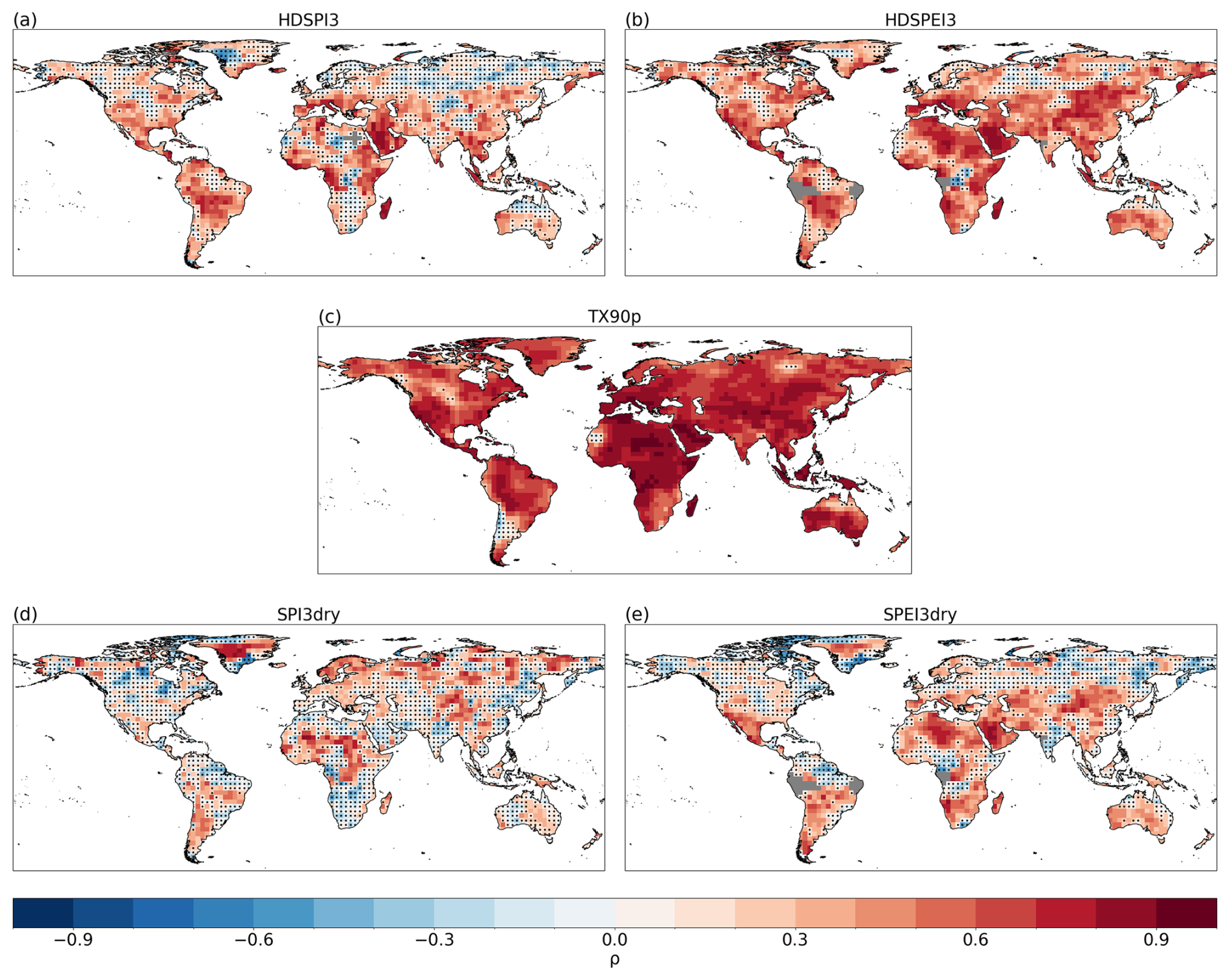 Figure 1Spearman's rank correlation for HDSPI3 (a), HDSPEI3 (b), TX90p (c), SPI3dry (d) and SPEI3dry (e) for the average forecast years 2–5 (1962–2014). Dots indicate regions where the correlation is not statistically significant at the 95 % confidence level. Grey areas indicate missing data.