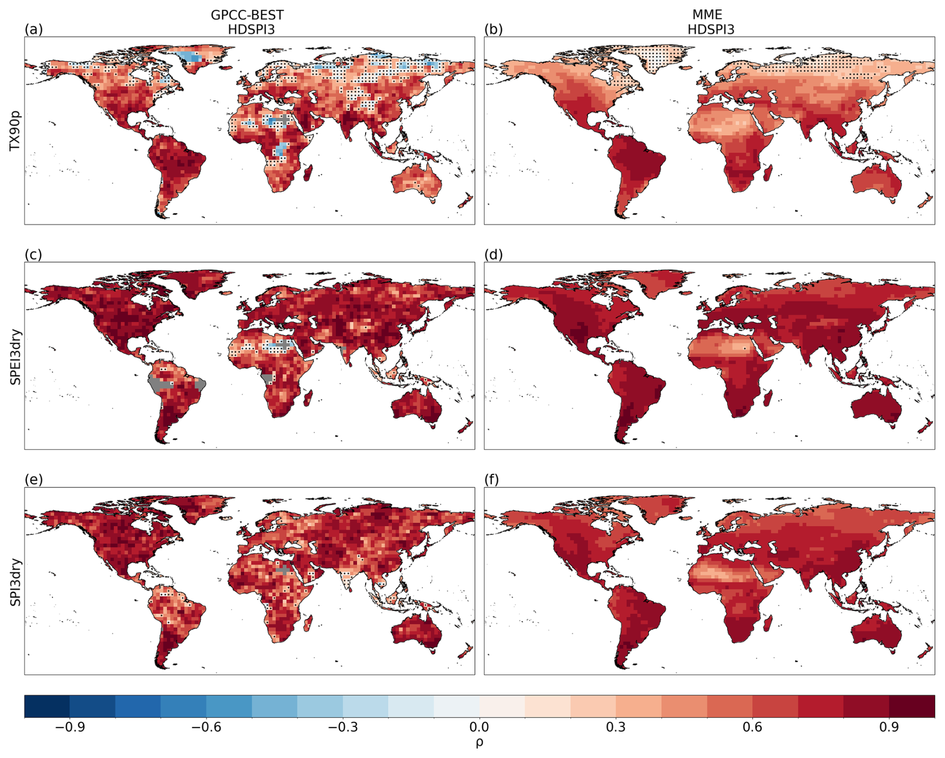 Figure 4Spearman's rank correlation between the annual sum of HDSPI3 and TX90p (a, b), SPEI3dry (c, d) and SPI3dry (e, f), respectively. For (a), (c), and (e): Correlations are calculated with GPCC-BEST, and dots indicate correlations not statistically significant at the 95 % confidence level. For (b), (d) and (f): Correlations represent the median (ensemble-wise) correlation for the DCPP MME ensemble, and dots indicate grid points where more than 50 % of the ensemble members provide correlations not statistically significant at the 95 % confidence level. Grey areas indicate missing data.