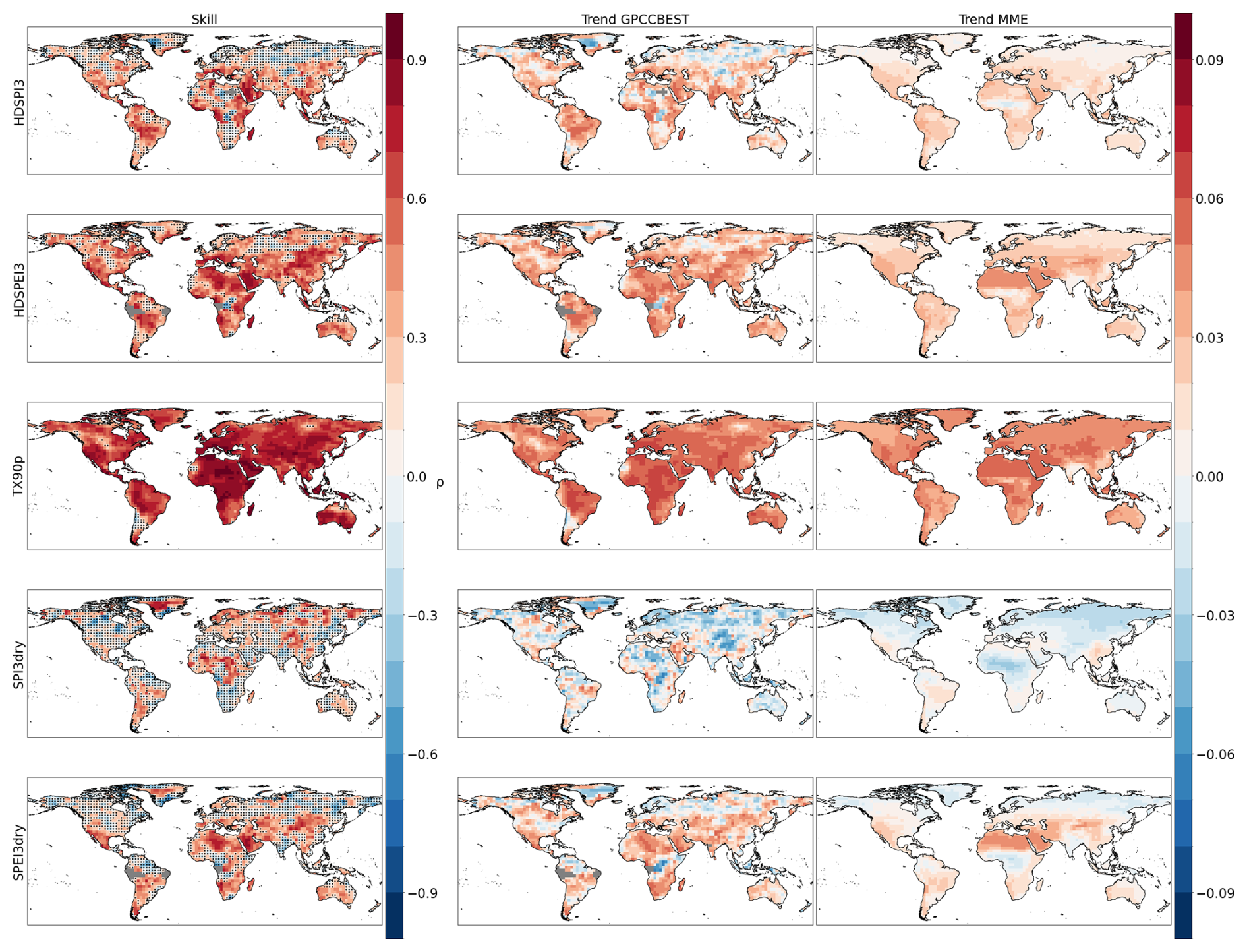 Figure A4First row: Spearman rank correlation between the GPCC-BEST dataset and the DCPP MME ensemble mean for HDSPI3, HDSPEI3, TX90p, SPI3dry and SPEI3dry respectively. Hatchings indicate correlations not statistically significant at the 95 % confidence level (p-value < 0.05) using a one-tailed test. Second row: Normalized trends in the GPCC-BEST dataset for HDSPI3, HDSPEI3, TX90p, SPI3dry and SPEI3dry respectively. Third row: Median normalized trends, calculated ensemble-wise, in the DCPP MME ensemble for HDSPI3, HDSPEI3, TX90p, SPI3dry and SPEI3dry respectively. Grey areas indicate missing data.