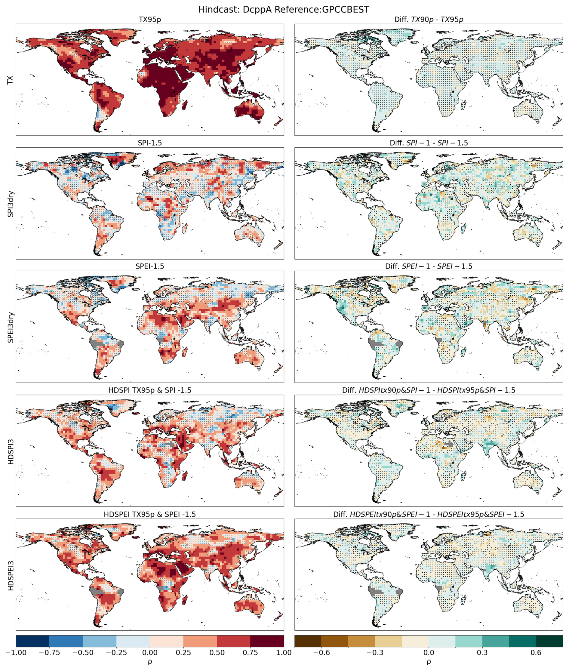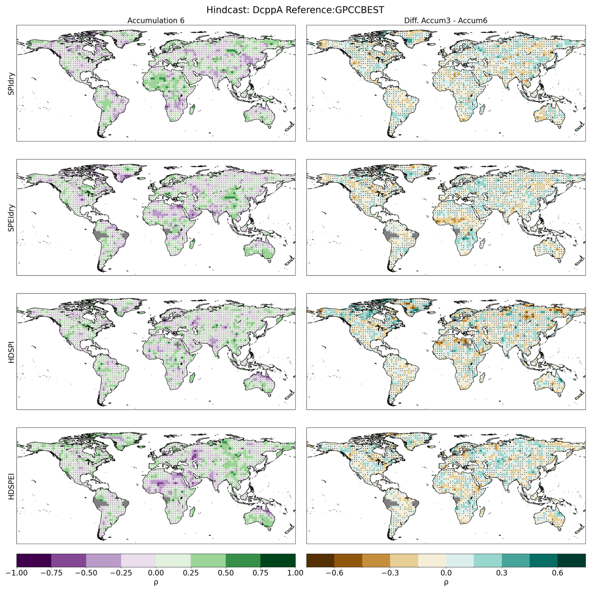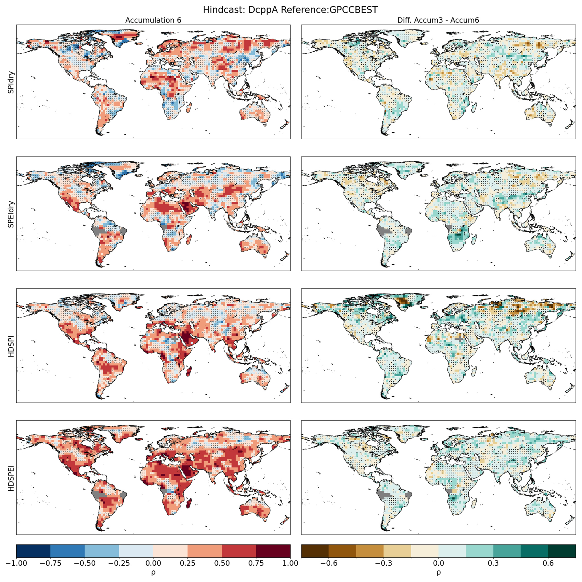 Figure A8First column: Spearman's rank correlation for calculated for dry and hot-dry compounds with a 6-month accumulation. Correlations are performed between the DCPP MME ensemble mean and the GPCC-BEST dataset. Second column: Difference between the accumulation used in the main study and the one shown in this figure. Hatchings indicate correlations (or differences between correlations) not statistically significant at the 95 % confidence level. The significance of the difference has been computed using a Steiger z-test. Grey areas indicate missing data.