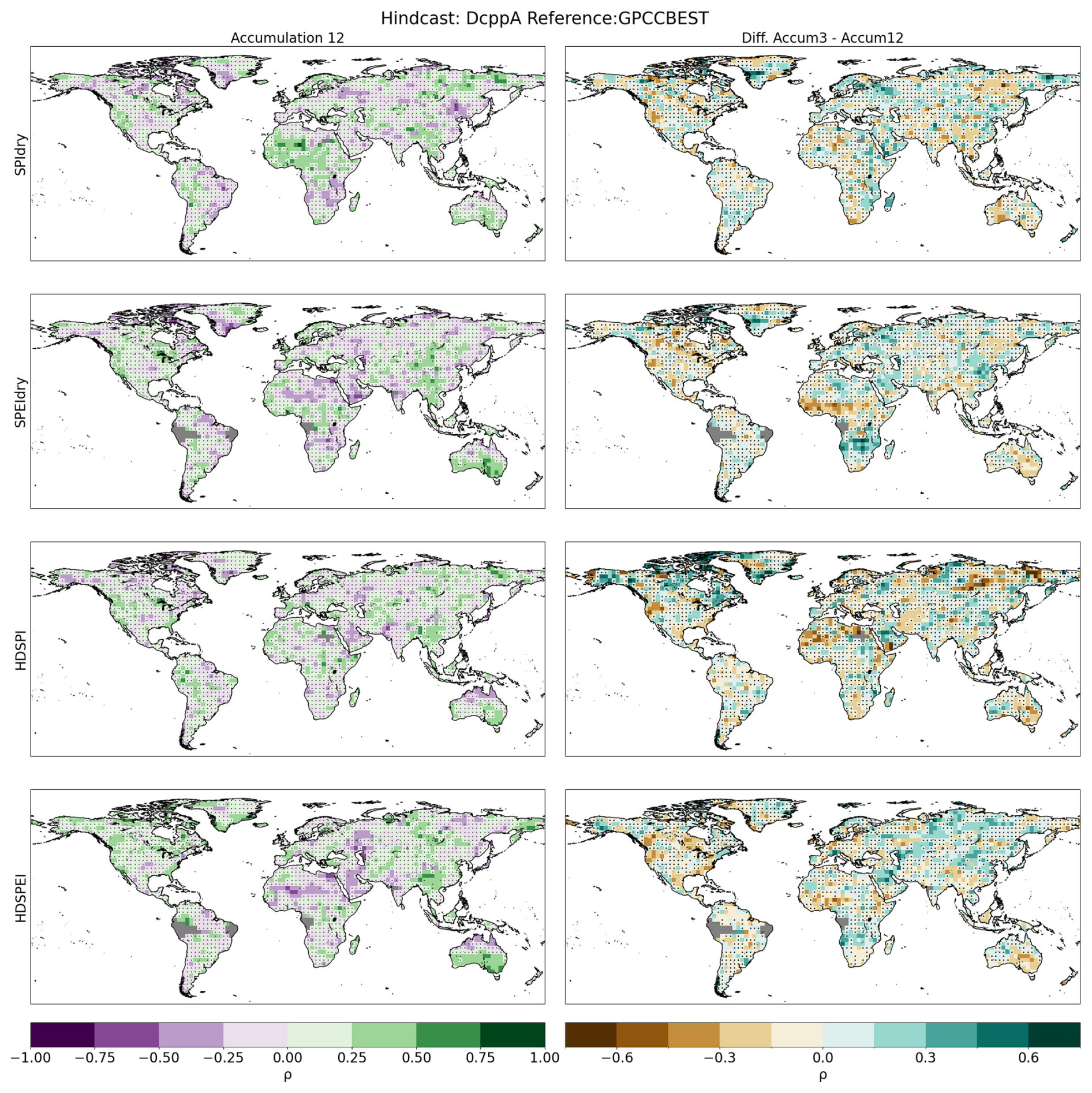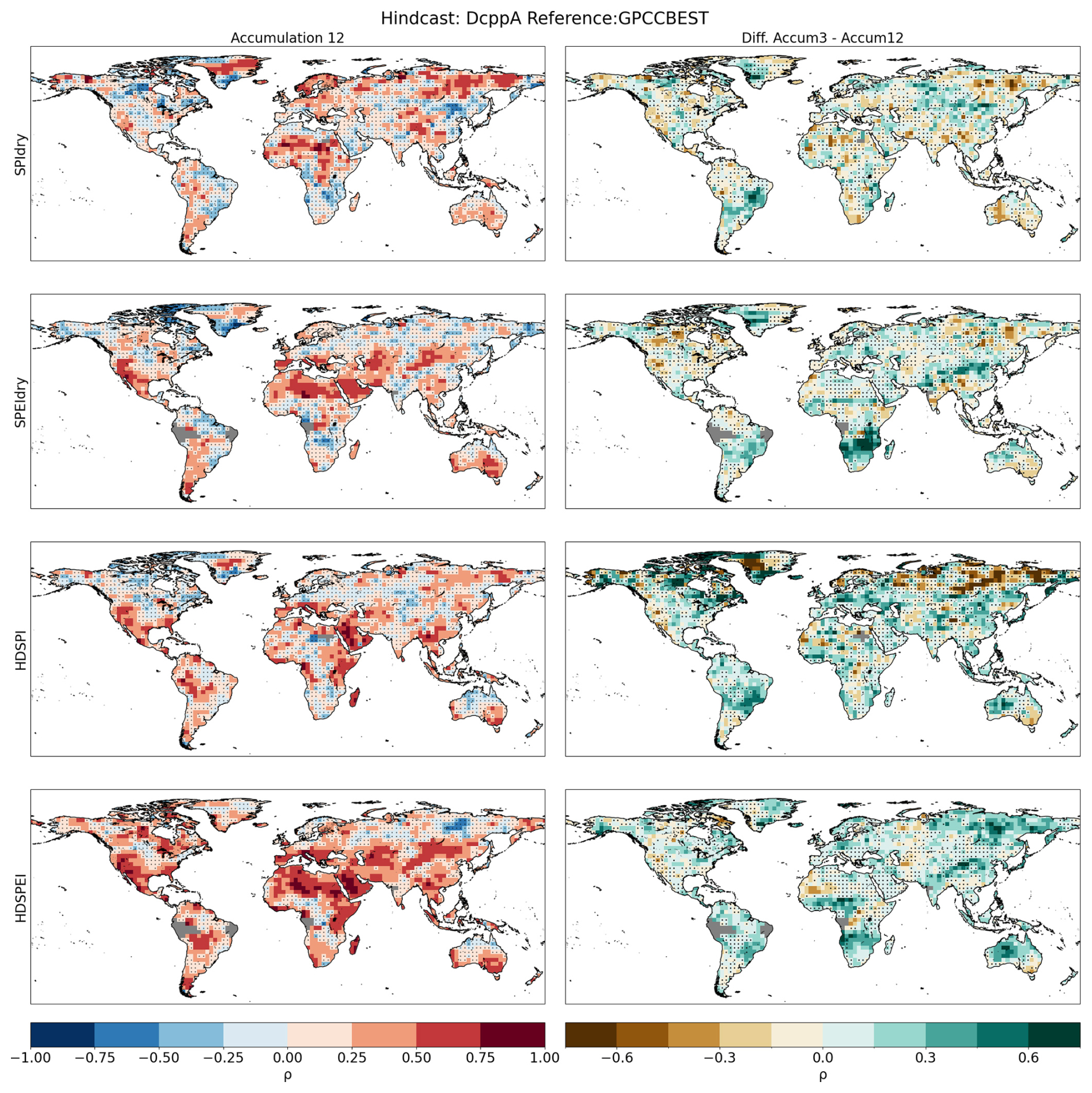 Figure A9First column: Spearman's rank correlation calculated for dry and hot-dry compounds with a 12-month accumulation. Correlations are performed between the DCPP MME ensemble mean and the GPCC-BEST dataset. Second column: Difference between the accumulation used in the main study and the one shown in this figure. Hatchings indicate correlations (or differences between correlations) not statistically significant at the 95 % confidence level. The significance of the difference has been computed using a Steiger z-test. Grey areas indicate missing data.