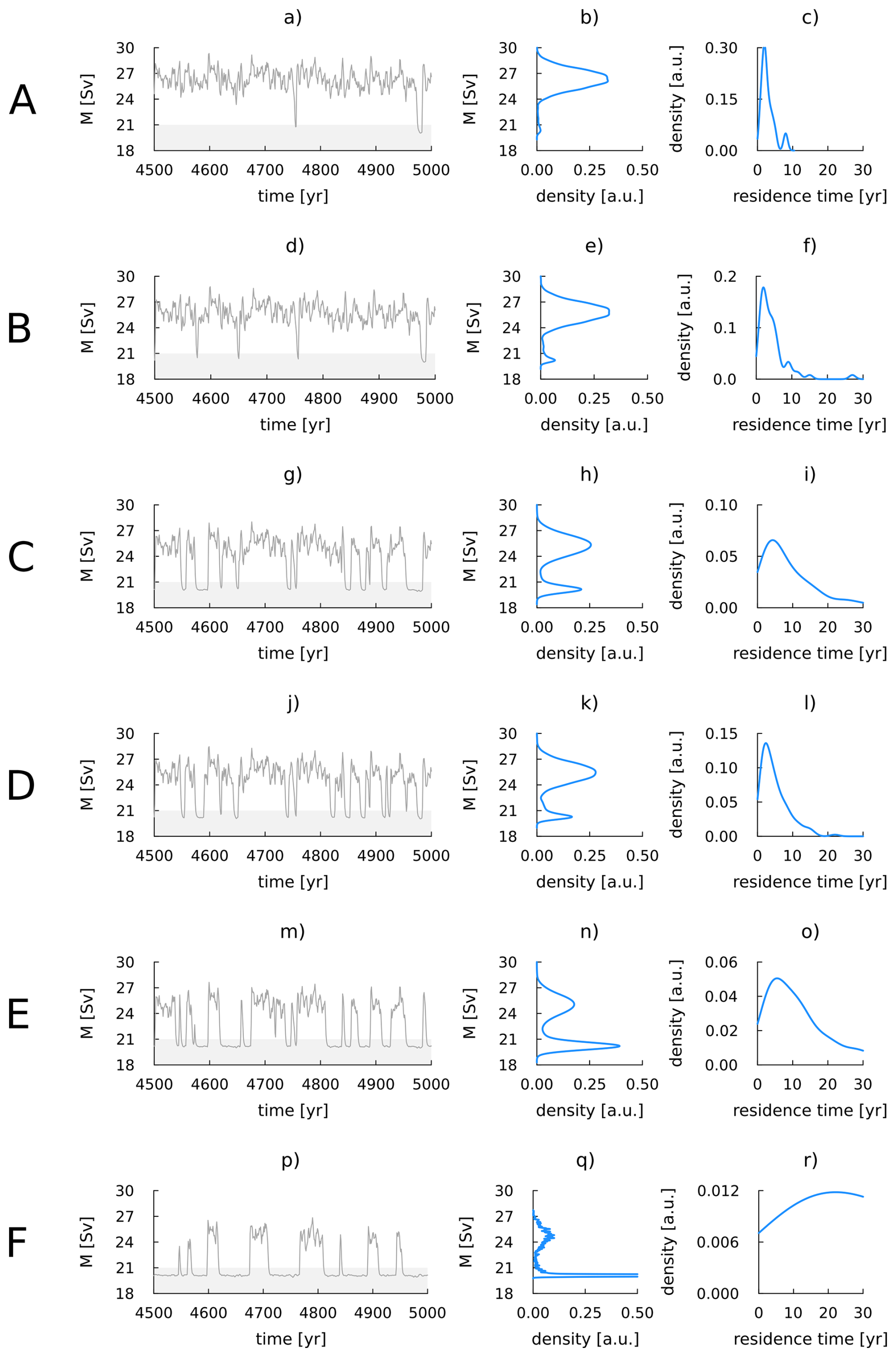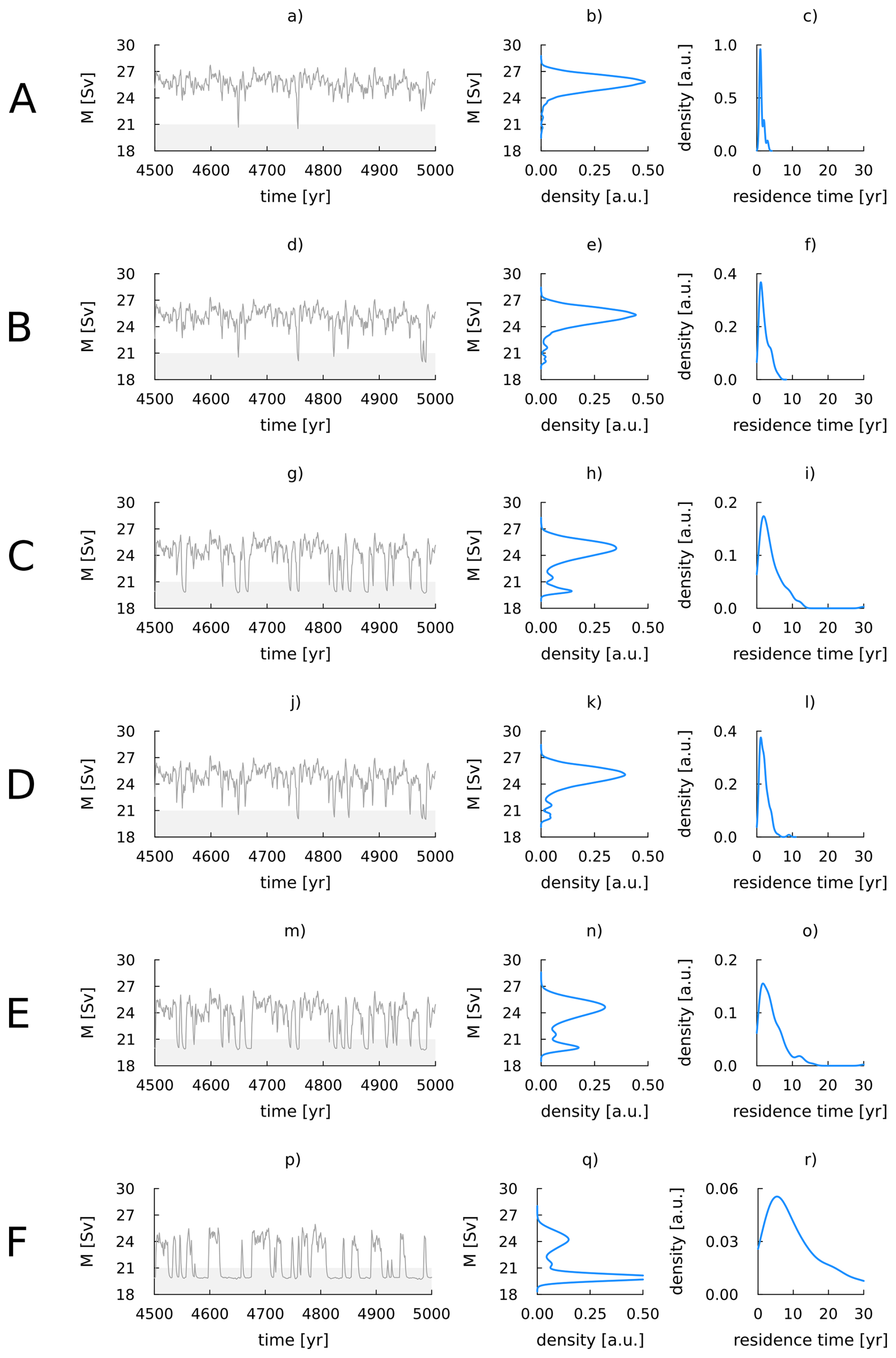 Figure C2Time series and statistics of time integrations of the non-autonomous model with noise level σS=0.5 psu. The letters A to F on the left denote the sets of parameter values in (S2,F)-space, as defined in Fig. 3. Subfigure (a) (d, g, j, m, p): time series of gyre transport M for the last 500 model years. The gyre is considered to be non-convective when M<21 Sv, indicated by grey shading in the time series. Subfigure (b) (e, h, k, n, q): kernel density of the gyre transport M, showing the relative occurence of years with and without convection. Subfigure (c) (f, i, l, o, r): kernel density of time spent in the state with no convection. Note that the y-axis of this right column is scaled differently for every plot. All integrations were performed for 5000 model years. Yearly averaged values were used to calculate the kernel density estimates.