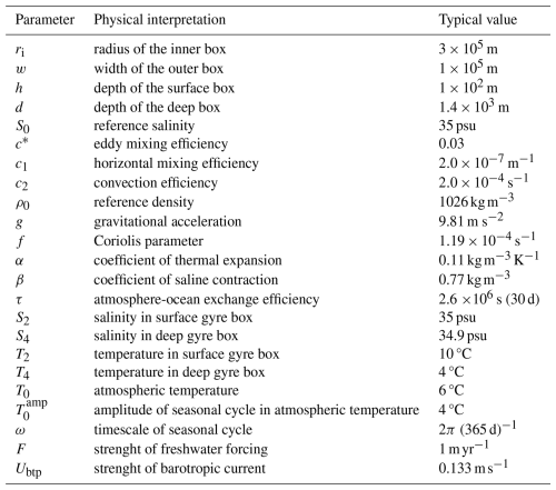 and similar for the equations describing S1, T3, and S3. Here c2 (with c2≫c1, taken here as m s−1) is the efficiency of mixing due to convection, and h and d are the depth of the upper and lower box, respectively. Taking high values for both c2 and k ensures that convective mixing between box 1 and 3 happens nearly instantaneously, in line with the implementation of convection in BS14. The convection terms are multiplied by the and to account for the different volumes of the boxes and conserve temperature and salinity during the convective mixing. The values of all dimensional parameters are shown in Table A1.