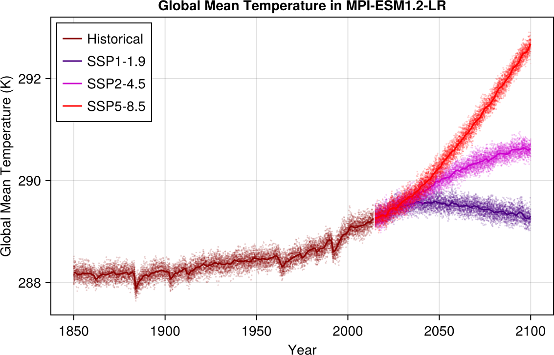 Each MPI-ESM1.2-LR ensemble member is run for the historical period, spanning 165 years between 1850–2014, and for various future warming scenarios spanning the 86 year future period 2015–2100. We consider output from simulations of three future scenarios from the ScenarioMIP experiments: SSP5-8.5, SSP2-4.5, and SSP1-1.9. The ScenarioMIP experiments are plausible futures corresponding to different climate mitigation and cooperation narratives (O'Neill et al.2016a; Tebaldi et al.2021a). Figure 1 reports the global mean temperature profiles of the historical period and the three future scenarios considered in this work for each of the 50 MPI-ESM1.2-LR ensemble members.