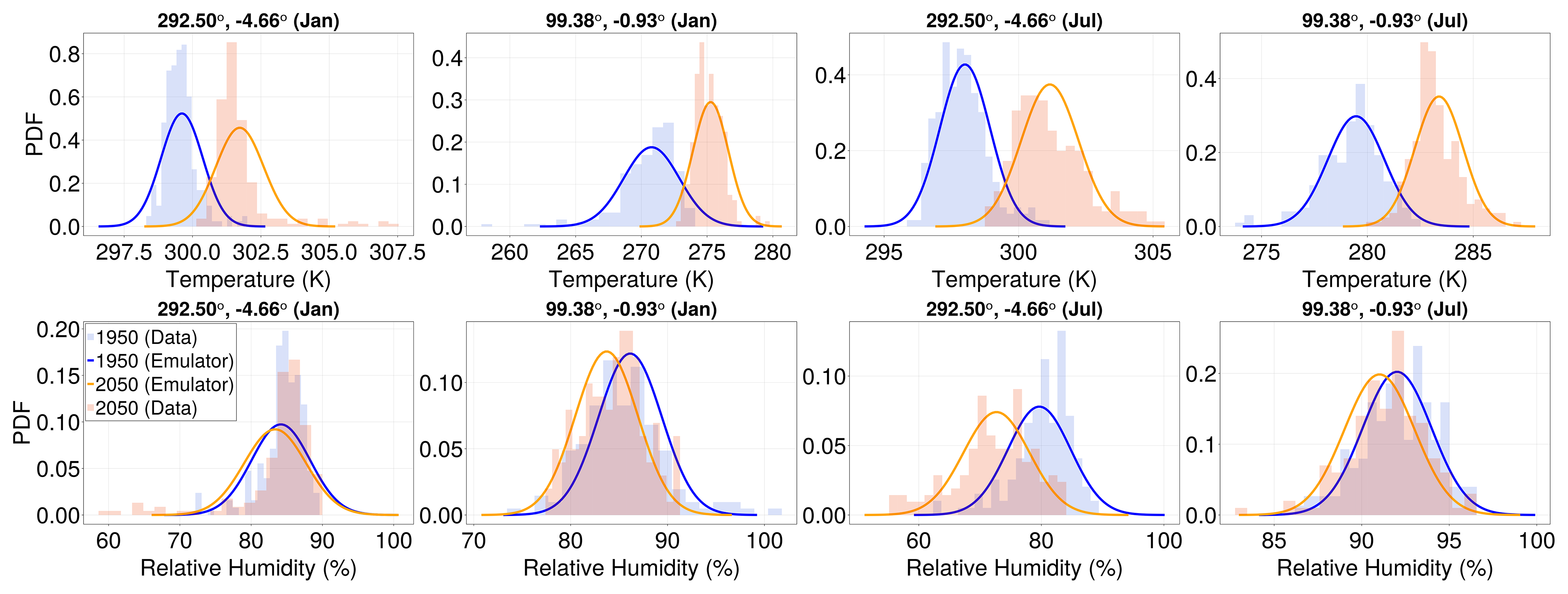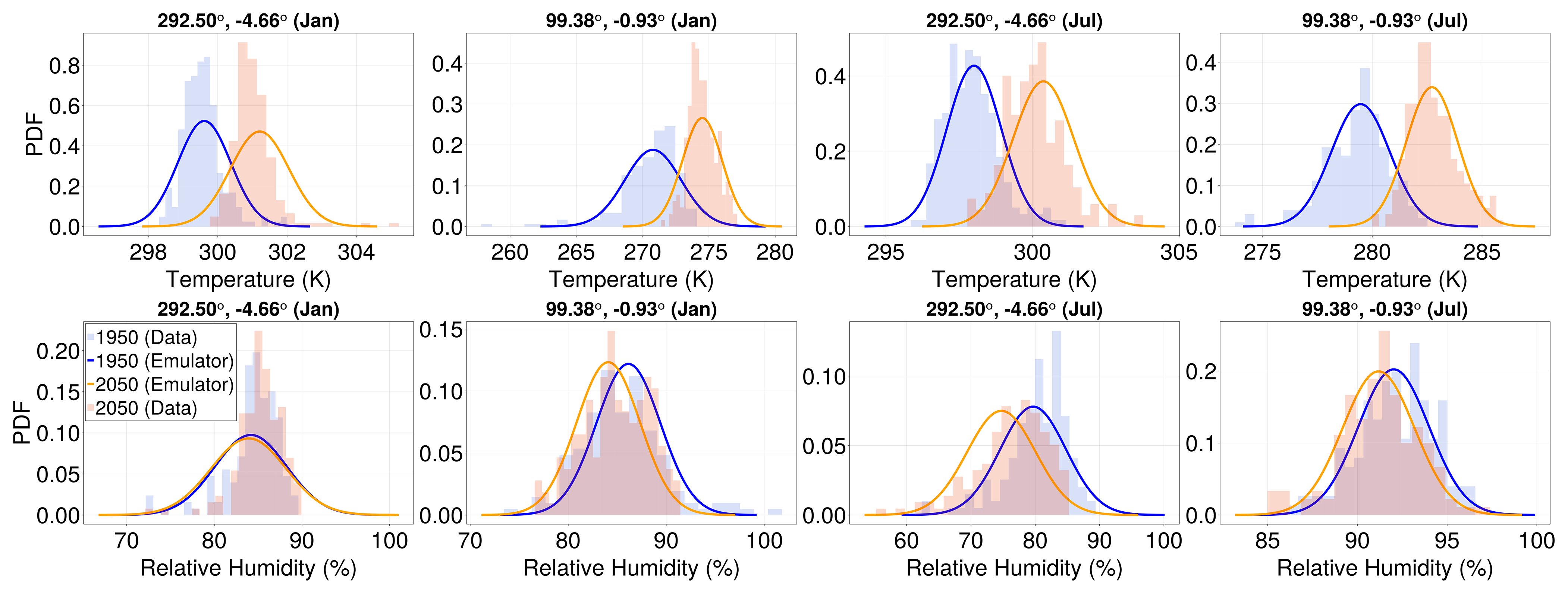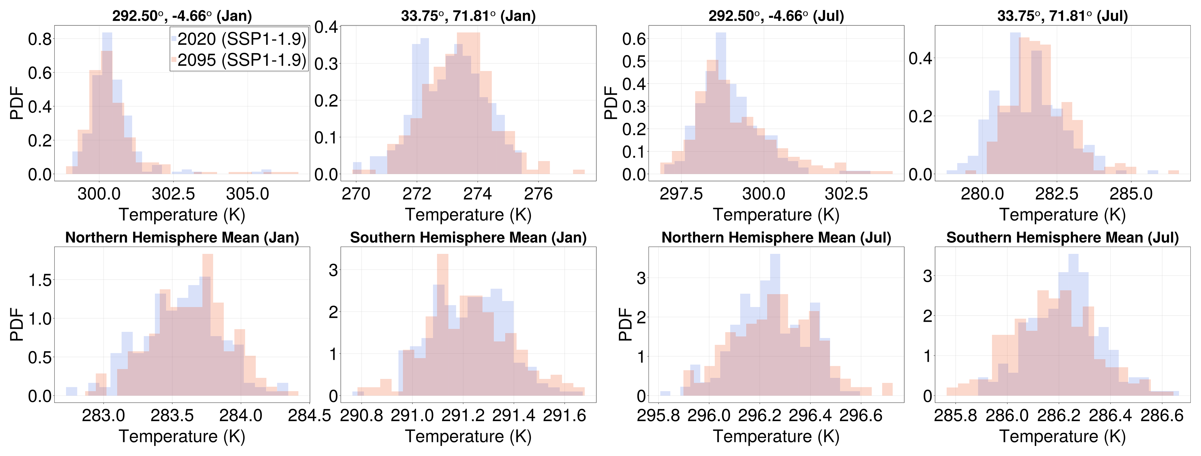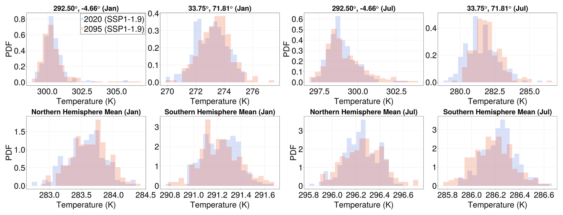 Figure 2Surface temperature histograms of the non-monotonic SSP1-1.9 scenario corresponding to similar global mean temperatures (Tg= 289.3 K) but for two different time intervals: 2018–2022 (blue bars) and 2093–2097 (red bars). Histograms are constructed for selected locations (top row) and hemisphere averages (bottom row) and for January (left) and July (right). The histograms mostly overlap, lending support to the choice of parameterizing the distributional change (and hence lower-order statistical changes) for a fixed month with only Tg.