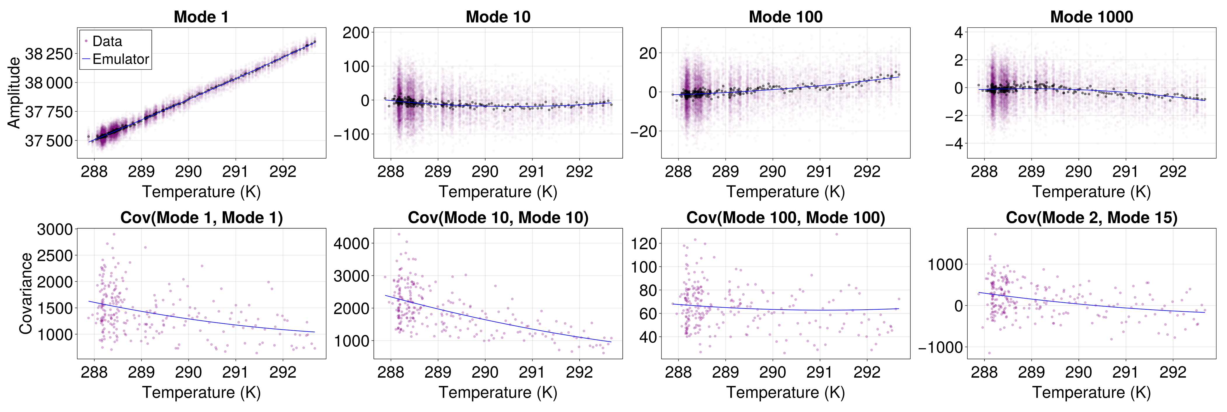 Figure 3Regression of mean (top row) and covariance (bottom row) of the surface temperature EOF amplitudes as a function of global, ensemble, and yearly mean temperature in January. Estimates from the MPI model ensemble simulations are shown as purple points, while the blue lines are the emulator fits. The quadratic fits capture both the linear trends and the slight curvature.