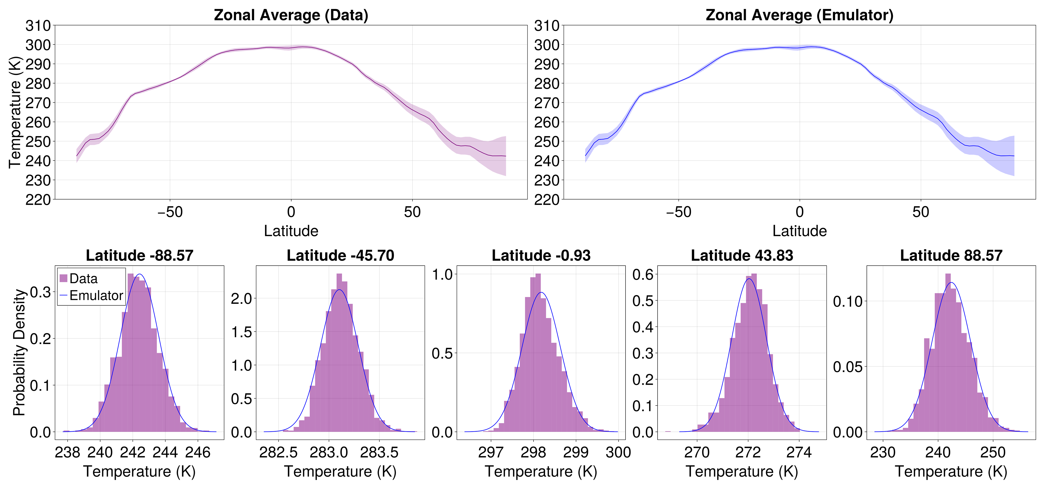The simplest and most common emulation technique is pattern scaling (Santer and Wigley1990; Huntingford and Cox2000; Mitchell2003). Pattern scaling estimates spatially resolved changes in climate variables by linearly regressing local variables on global mean surface temperature or cumulative emissions. While pattern scaling has been shown to have remarkable skill in emulating projected changes in local mean temperatures (Santer et al.1990; Lütjens et al.2025), it has no inherent probabilistic component and is less accurate for other climate variables (Tebaldi and Arblaster2014; Tebaldi and Knutti2018; Kravitz and Snyder2023). Recent work has been dedicated to constructing machine learning-based climate emulators (e.g. Watson-Parris et al.2022; Kitsios et al.2023; Yu et al.2024; Christensen et al.2024) to move beyond the linear assumption inherent in pattern scaling. However, questions remain about their overall skill compared to linear pattern scaling (Lütjens et al.2025). Additionally, their lack of interpretability and the computational cost of model training may limit their applications. The emulator discussed in this work is rooted in the paradigm of statistical emulation as a function of globally averaged surface temperature (e.g., pattern scaling) rather than in the alternative paradigm of autoregressive emulation that predicts the evolution of climate variables or of their statistics as a function of initial conditions (e.g., autoregressive machine learning models). In particular, we aim to emulate spatially averaged second-order statistics of variables of interest given a specified future value of globally averaged surface temperature.