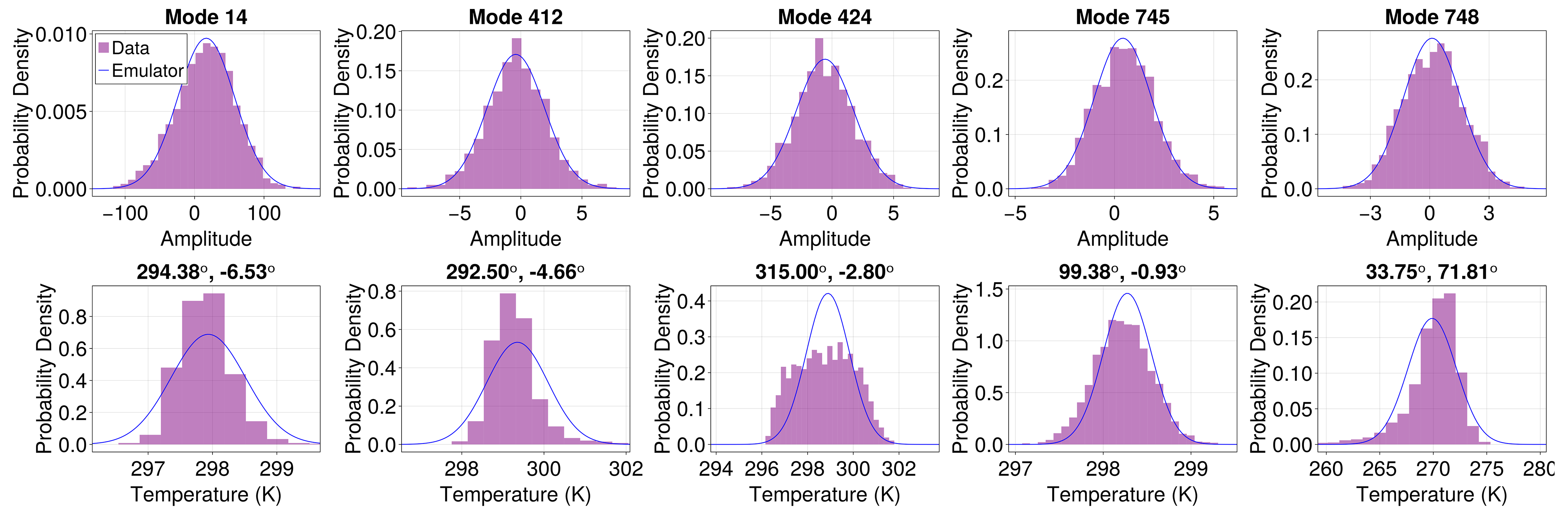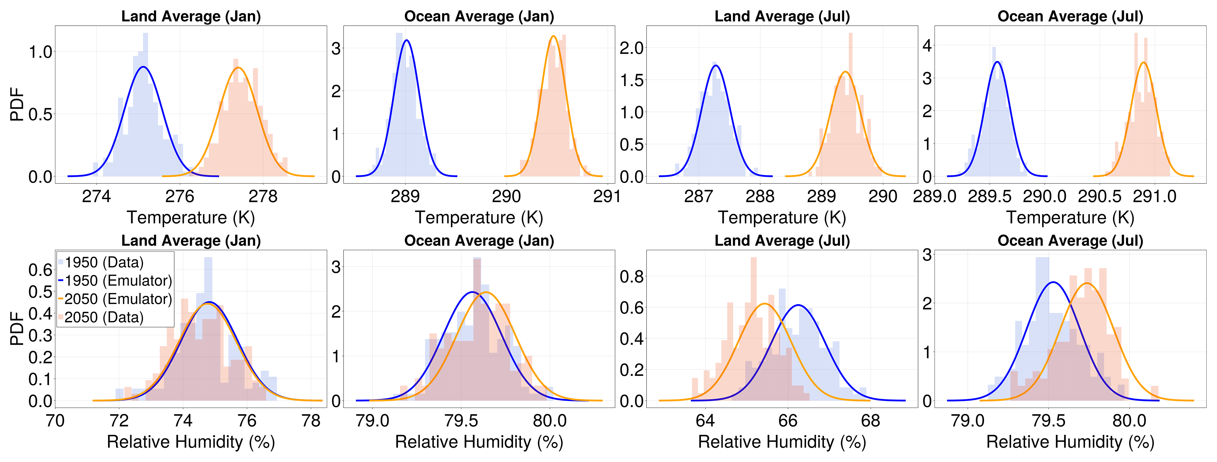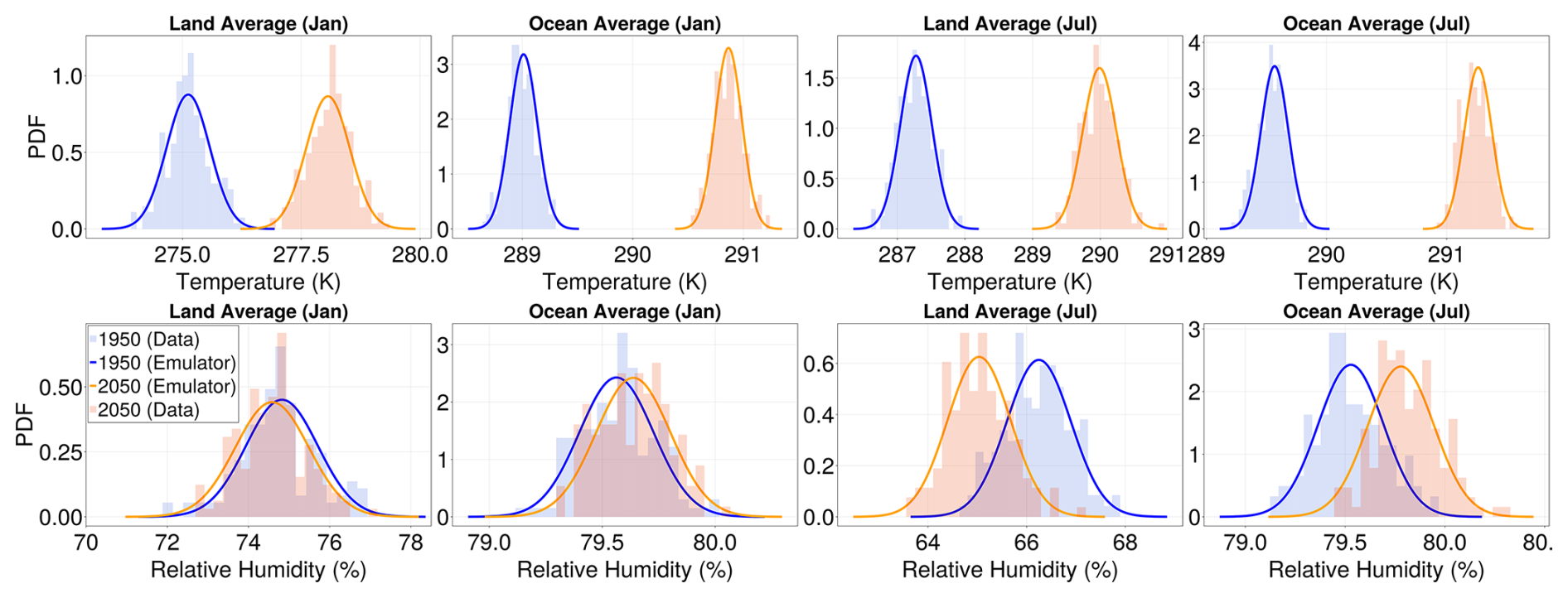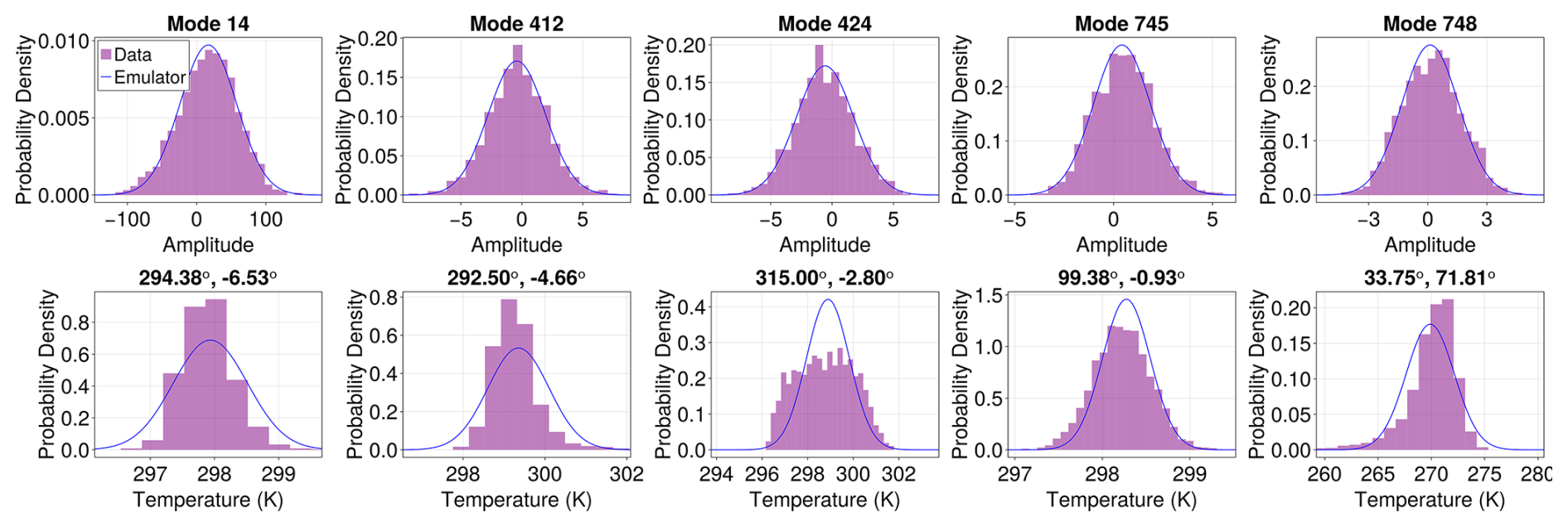 After projecting the ESM data into the EOF space, we model the EOF coefficients as a function of global mean temperature (see also Holden and Edwards2010; Bruckner et al.2003) and proceed to emulate their means and covariances. The method can be applied to any variables regardless of their distributions insofar as one is only interested in the means and covariances of any linear functional of the variable field, see Sect. 4.2. Despite not requiring a Gaussian approximation, we will often overlay histograms of variables from the MPI model with Gaussian distributions with the means and covariances generated by our emulator. This is an arbitrary, yet somewhat constrained choice because a Gaussian distribution is among the most natural ways to visualize a distribution parameterized solely by its mean and variance. It so happens, however, that the EOF amplitudes of monthly average temperature and relative humidity have approximately Gaussian distributions. This is to be expected from the multivariate version of the central limit theorem, which states that any variable that is the average of many independent realizations of the same process has a Gaussian distribution. In our case, we average in time, over a month, and in space by the coarse-graining implied by the EOF decomposition. See Appendix A for further discussion.