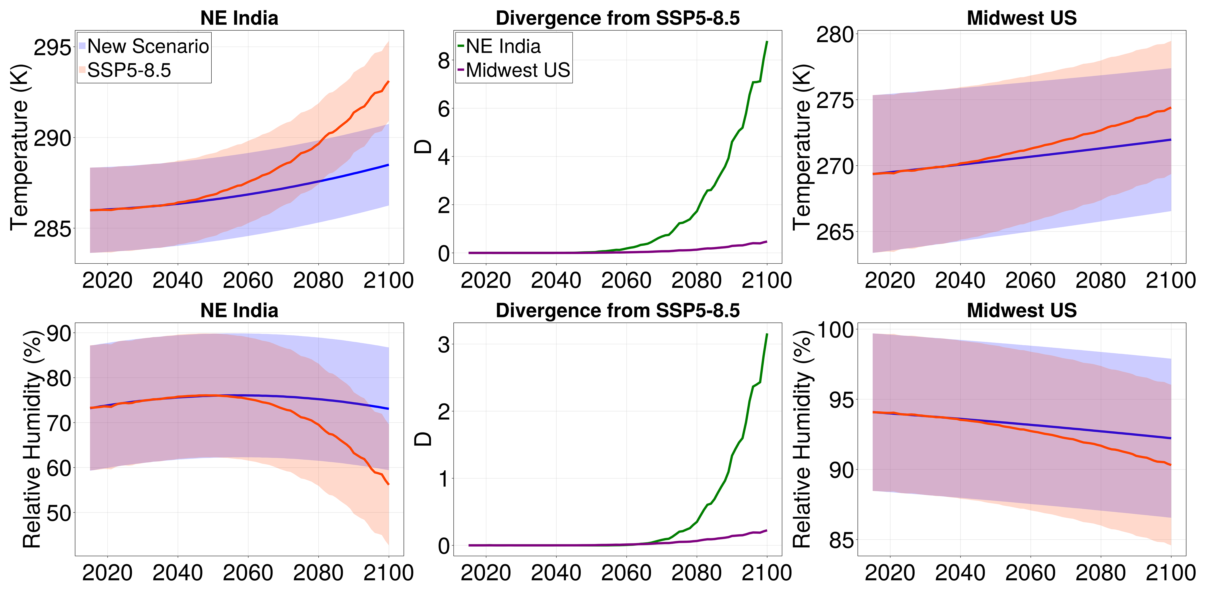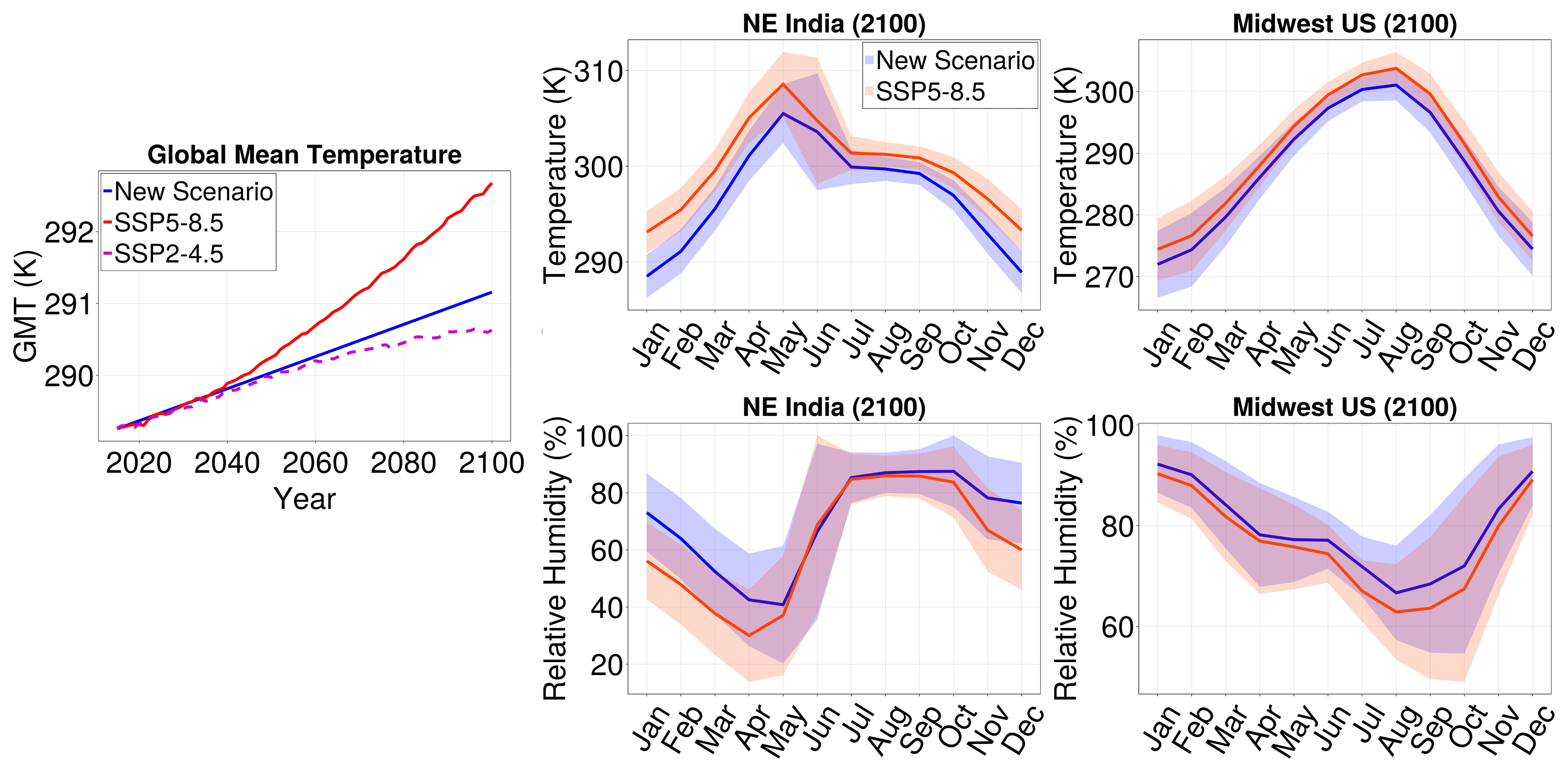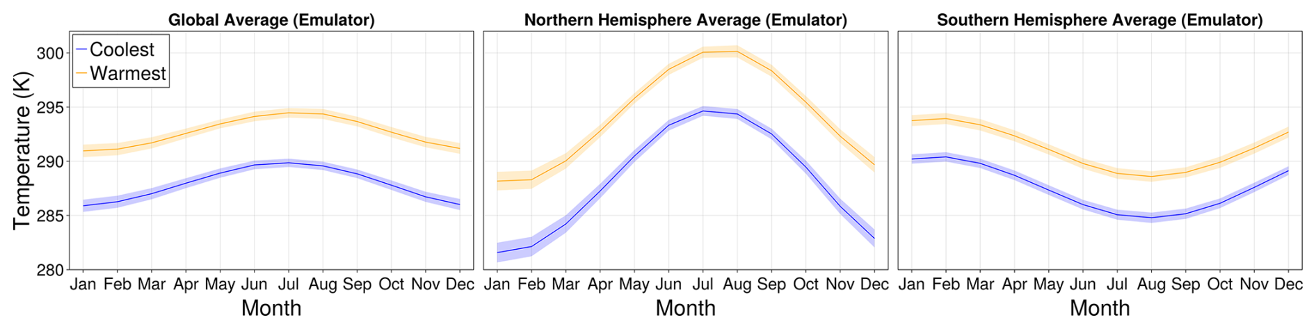 The climate emulator literature includes models on many timescales, ranging from yearly to monthly to daily. The temporal resolution required depends on the specific application of the emulator. In this work, we use monthly data for illustrative purposes; our approach to emulation could be applied to other temporal resolutions as well, as in Wang et al. (2025). Projections of monthly climate statistics are important for understanding a number of impacts of climate change, such as changes in the seasonal cycle, water management, and other phenomena of agricultural relevance (Guo et al.2002; Odjugo2010; Schlenker and Roberts2009; Mishra and Singh2010; Stéfanon et al.2012). Furthermore, some emulators with finer temporal resolution, such as the one in Bassetti et al. (2024), require monthly projections as input; our emulator could thus be used as pre-conditioning information. Importantly, by emulating statistics beyond the mean, our emulator provides additional information that may be used to condition downstream models or aid in decision-making (e.g., via uncertainty quantification through emulated ensemble spread). Such a modular emulation pipeline is common, as illustrated by the MESMER family of emulators (Beusch et al.2020; Nath et al.2022; Quilcaille et al.2022, 2023).
